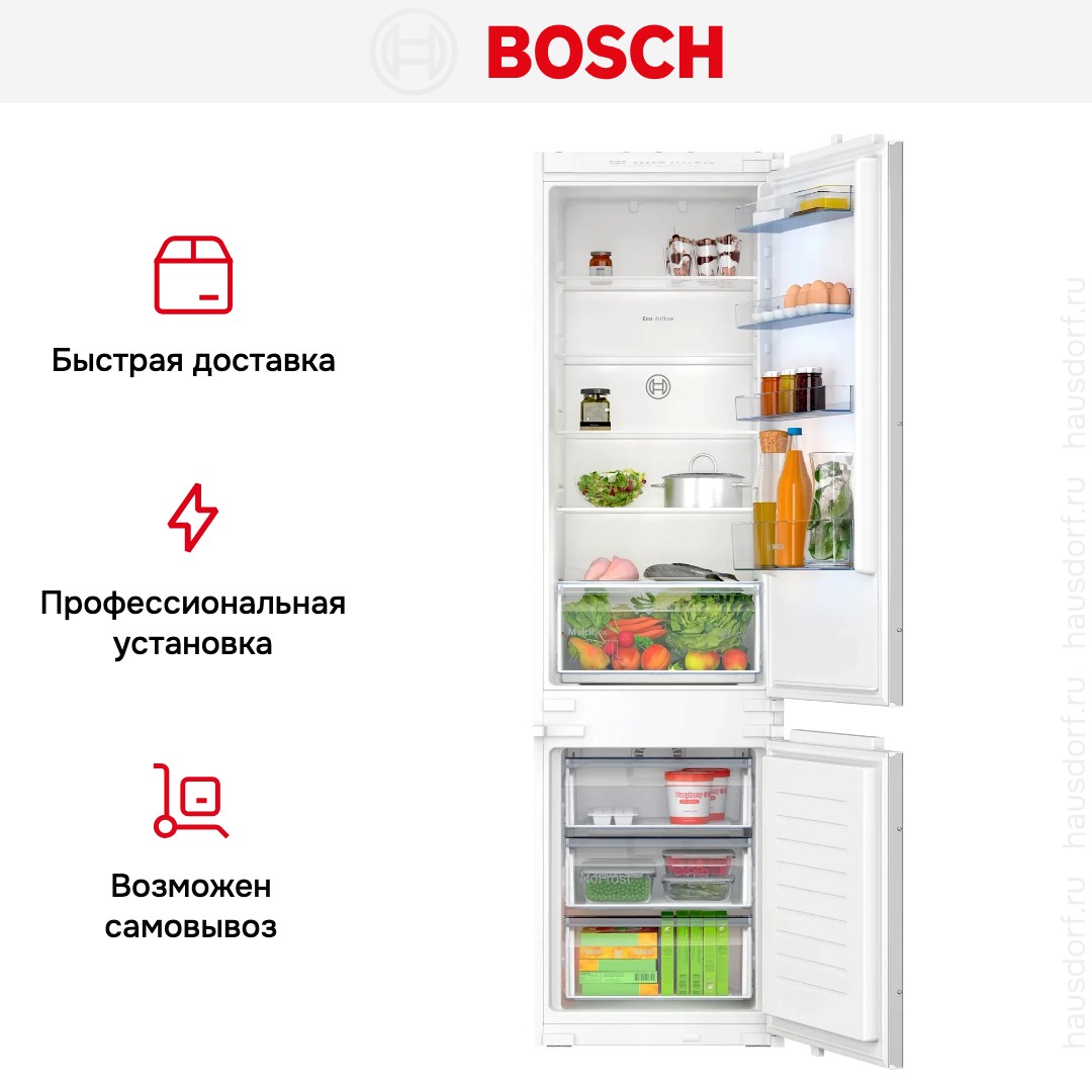 Преимущества по сравнению с простыми встроенными моделями очевидны: более тихая и энергоэффективная работа благодаря инверторному компрессору, отсутствие инея в морозильнике, гибкая организация внутреннего пространства и аккуратная интеграция под фасад. Такой прибор подойдет для тех, кто ценит порядок в холодильнике и минимальный уход за техникой.