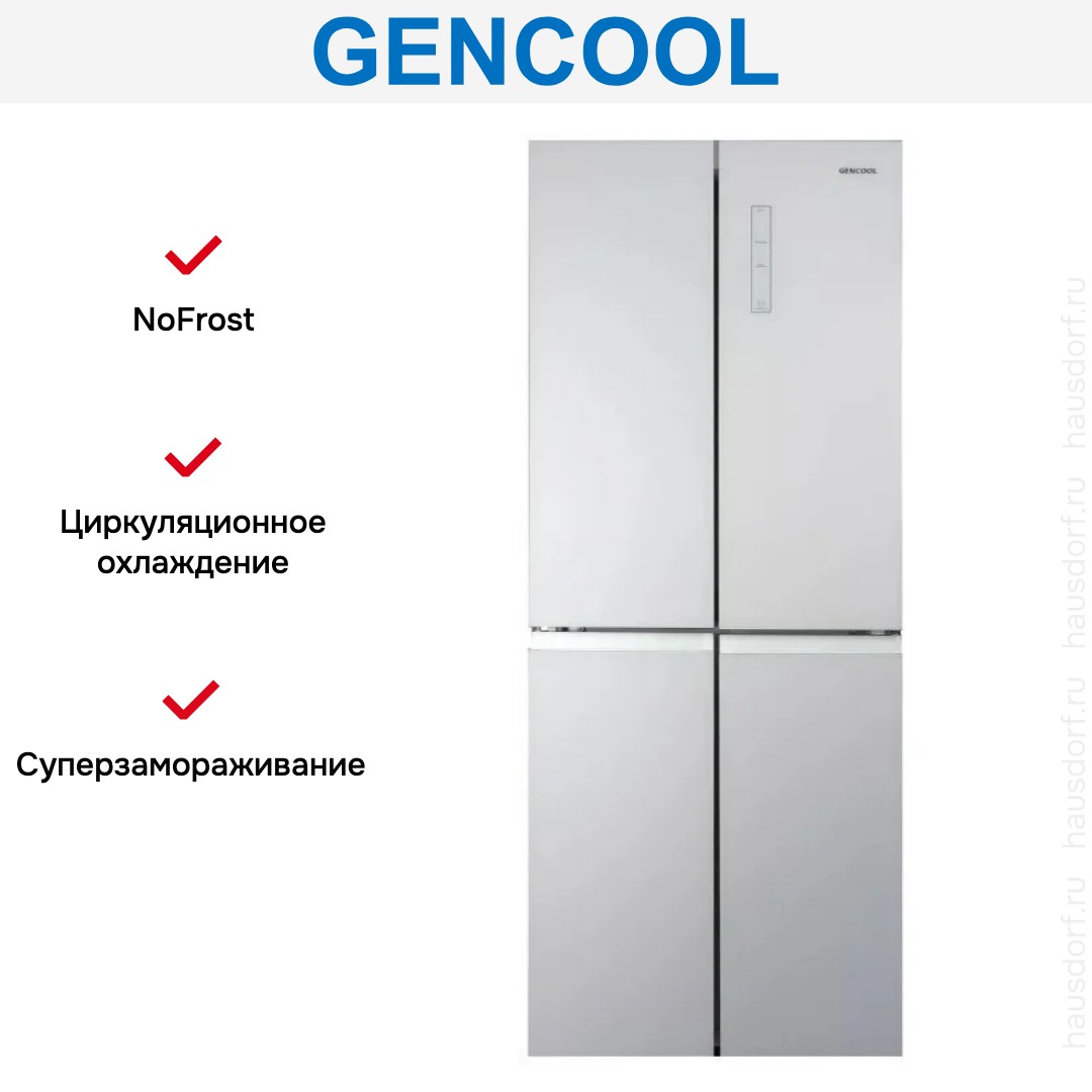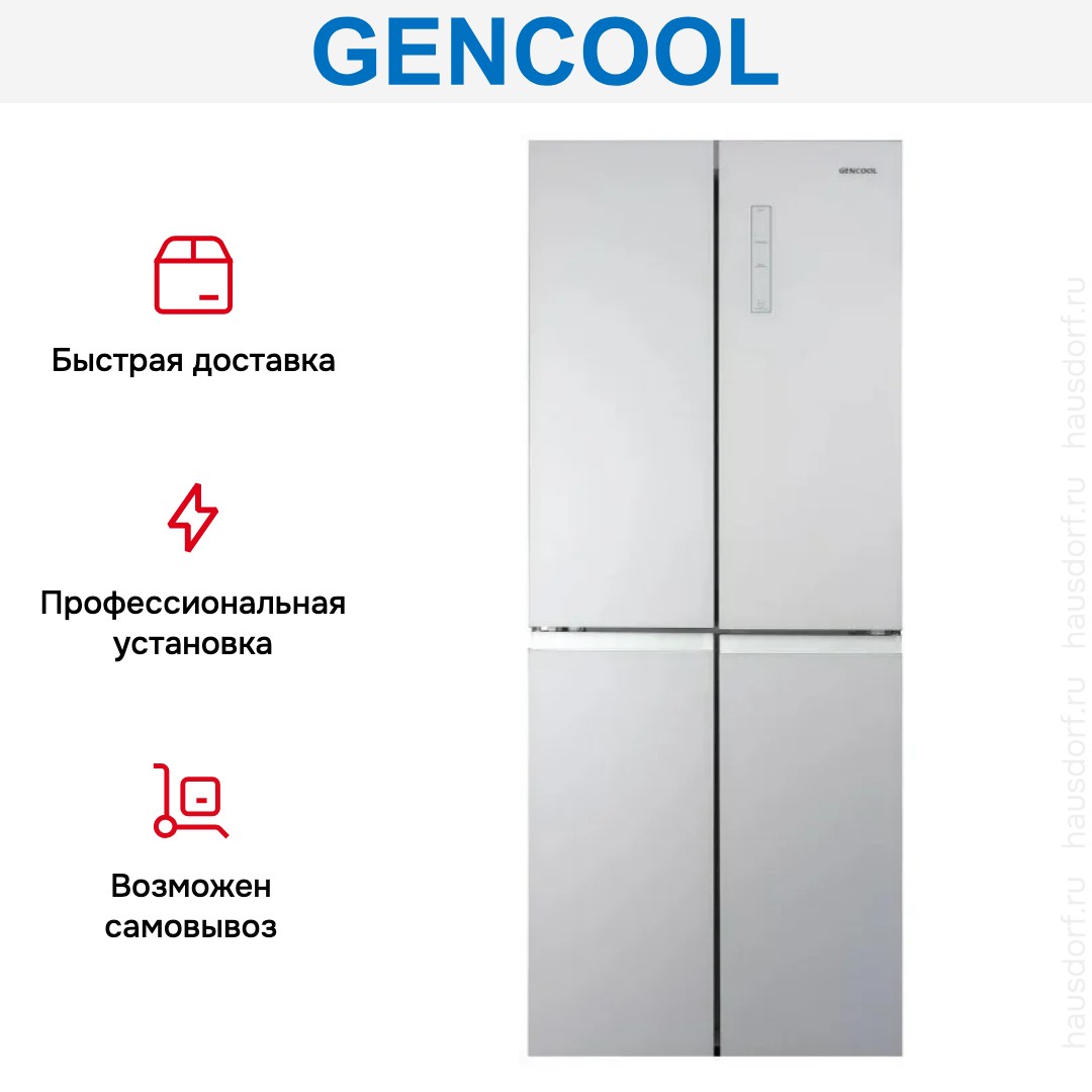 Холодильник Gencool GDCD-350WG — отдельно стоящая модель высотой 175 см, шириной 70 см и глубиной 60 см. Его строгий белый корпус легко вписывается в разные интерьерные решения. Четыре двери и продуманная геометрия создают впечатление аккуратности и визуальной легкости. Side-by-Side дверной упор обеспечивает удобный доступ к секциям и минимальную требовательность к месту при открывании. Матовая поверхность практична, отпечатки и мелкие царапины не бросаются в глаза, что важно для повседневного использования.