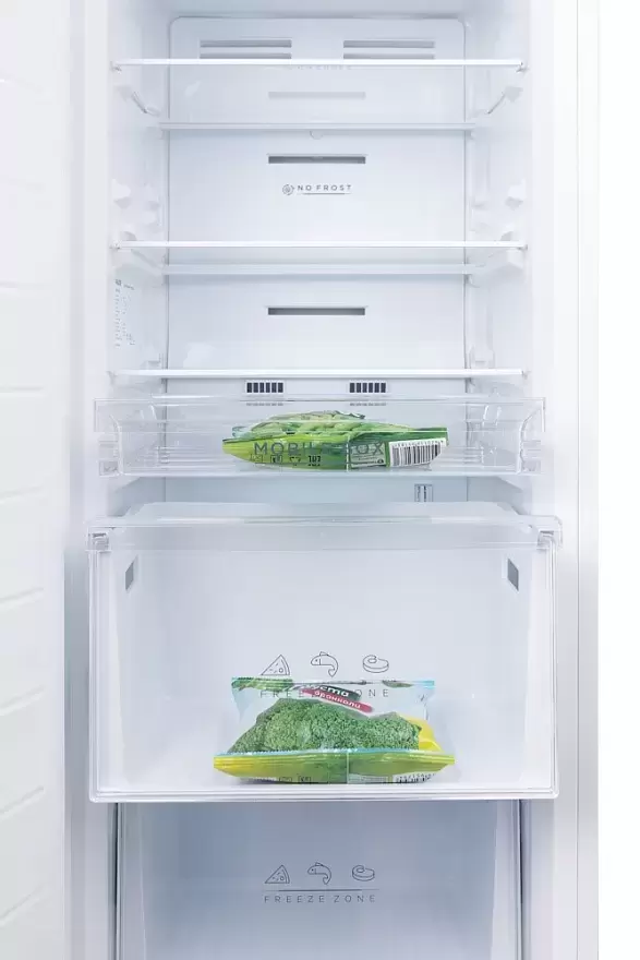Образование льда предотвращает специальный вентилятор, который заставляет холодный воздух циркулировать по всему пространству морозильника. Лед при этом оседает не на стенках, а выводится за пределы камеры и остается на испарителе холодильника. Вентилятор работает попеременно с нагревателем, благодаря чему иней на испарителе оттаивает, а талая вода стекает в поддон, откуда испаряется естественным способом. Вопреки распространенному мнению, в морозильнике с системой No Frost продукты не заветриваются и не сохнут, а энергопотребление ненамного превышает этот показатель для обычных холодильников.