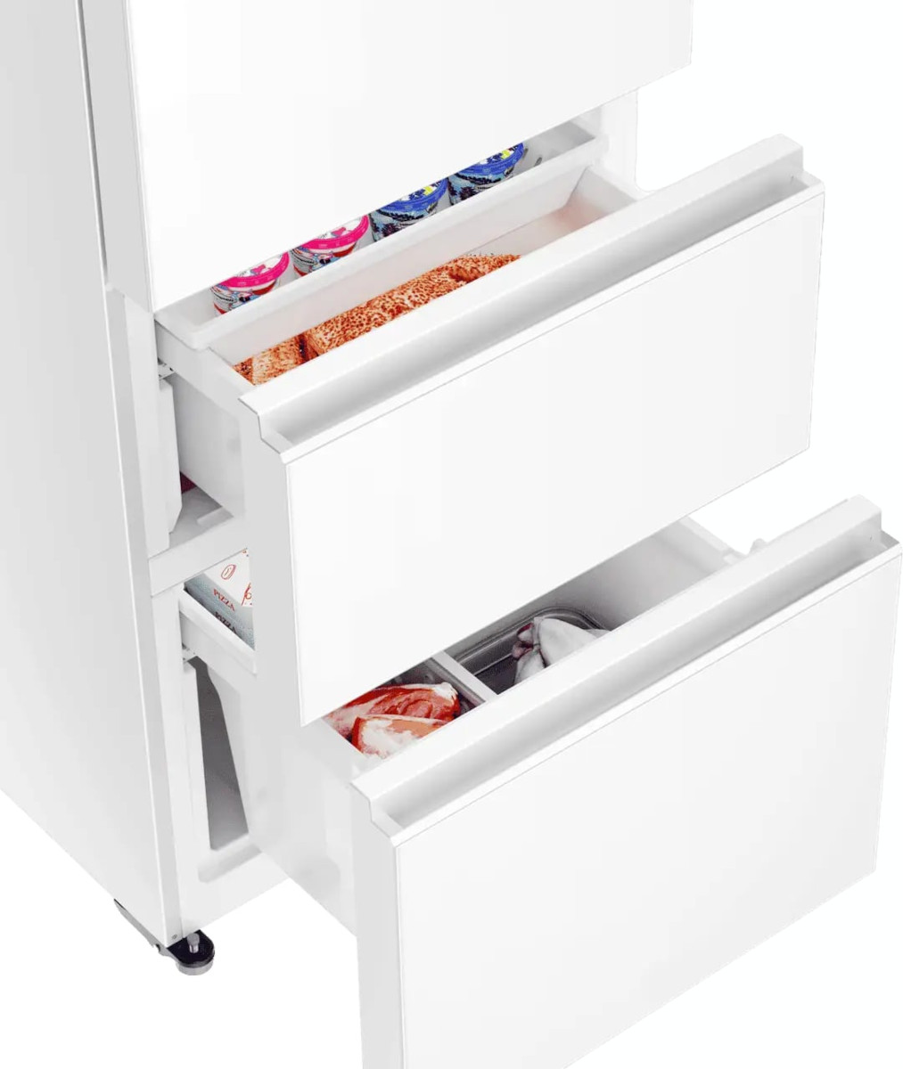 Трехкамерные модели выпускаются в нескольких вариантах. В некоторых случаях в качестве третьей камеры поступает так называемая зона свежести — отделение, где поддерживается температура около 0 градусов. В другом варианте подобные модели имеют морозильную камеру, состоящую из двух выдвижных ящиков.