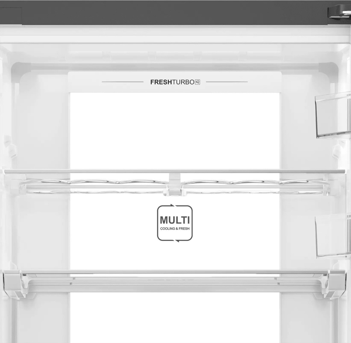Специальная зона свежести предназначена для правильного и более длительного хранения овощей, фруктов, зелени. В ней поддерживается околонулевая температура, поэтому продукты не перемораживаются и не пересыхают. Система охлаждения этого холодильника — многопоточное охлаждение Multi-flow.