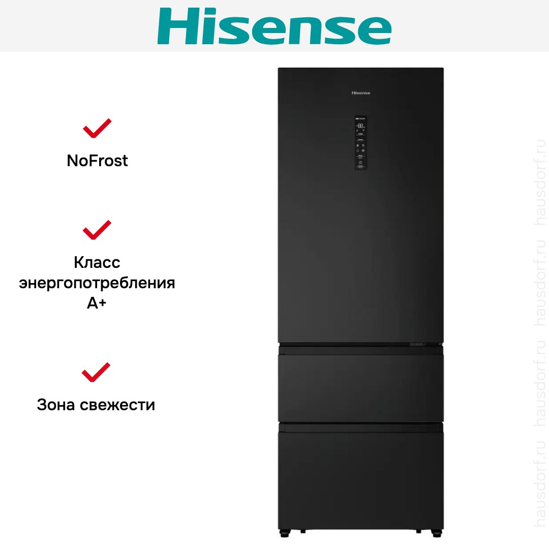 Холодильник Hisense RT641N4AF1 имеет элегантный черный корпус со встроенной ручкой. Его высота 200 см и ширина 70,4 см создают внушительную вместительность, при этом глубина 69,4 см сохраняет баланс между полезным объемом и удобством расположения в нише. Дизайн выполнен с акцентом на четкие линии и практичность без лишних деталей. Трехдверная компоновка с нижней морозильной камерой облегчает доступ к часто используемым продуктам. Черная матовая поверхность меньше подвержена видимым отпечаткам, а встроенная ручка не выступает за линию фасада.