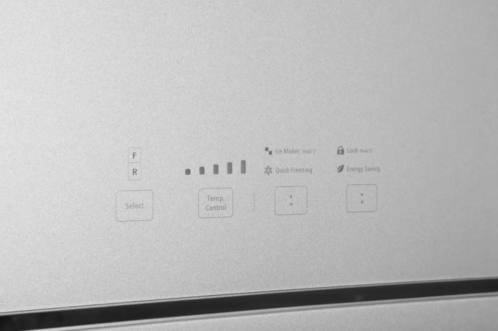 Гораздо точнее сориентироваться по индикаторам можно в холодильниках с электронной системой управления. Эти устройства обычно оснащены дисплеем, на котором высвечиваются значения фактической температуры в холодильной и морозильной камерах. Рядом с ними располагаются кнопки, во многих случаях сенсорные, при помощи которых можно регулировать температуру в каждой камере отдельно, и индикаторы включения этих камер. Здесь же, на панели инструментов, находятся индикаторы, указывающие на активацию дополнительных опций — например, режимов быстрого замораживания и быстрого охлаждения, отпускного режима, блокировки панели управления от детей.