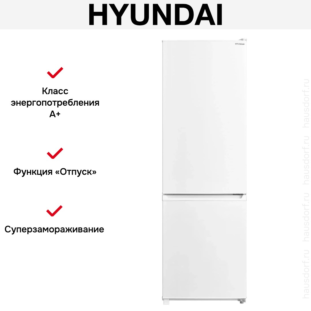 Холодильник Hyundai CC3091LWT — отдельно стоящий двухкамерный агрегат с морозильной камерой внизу и лаконичным белым фасадом из металла.