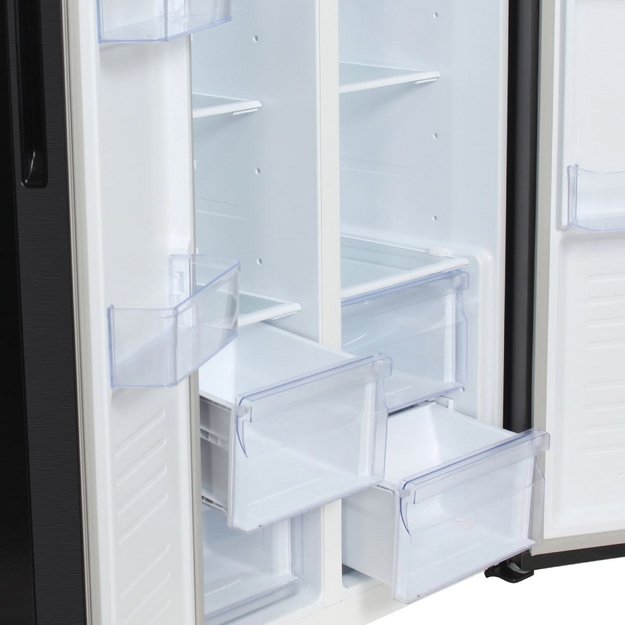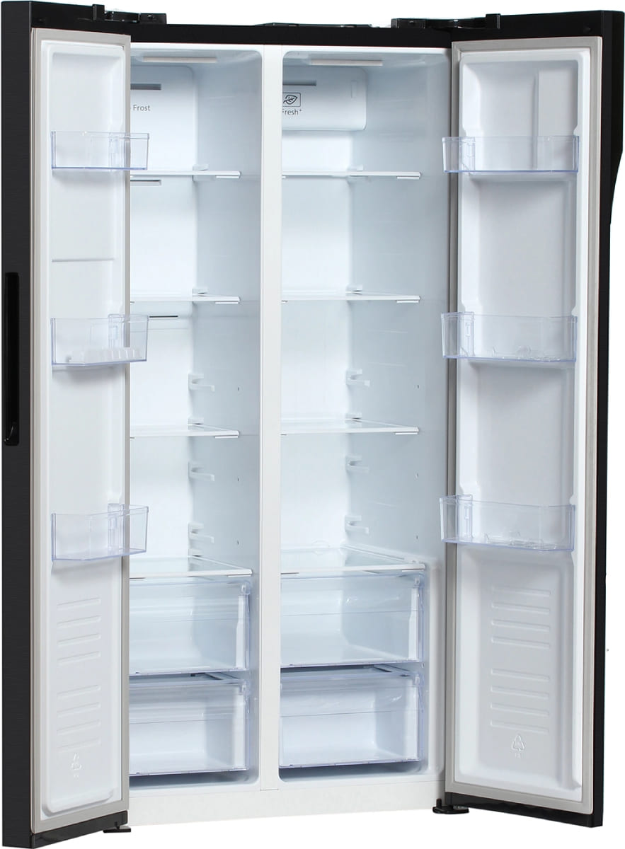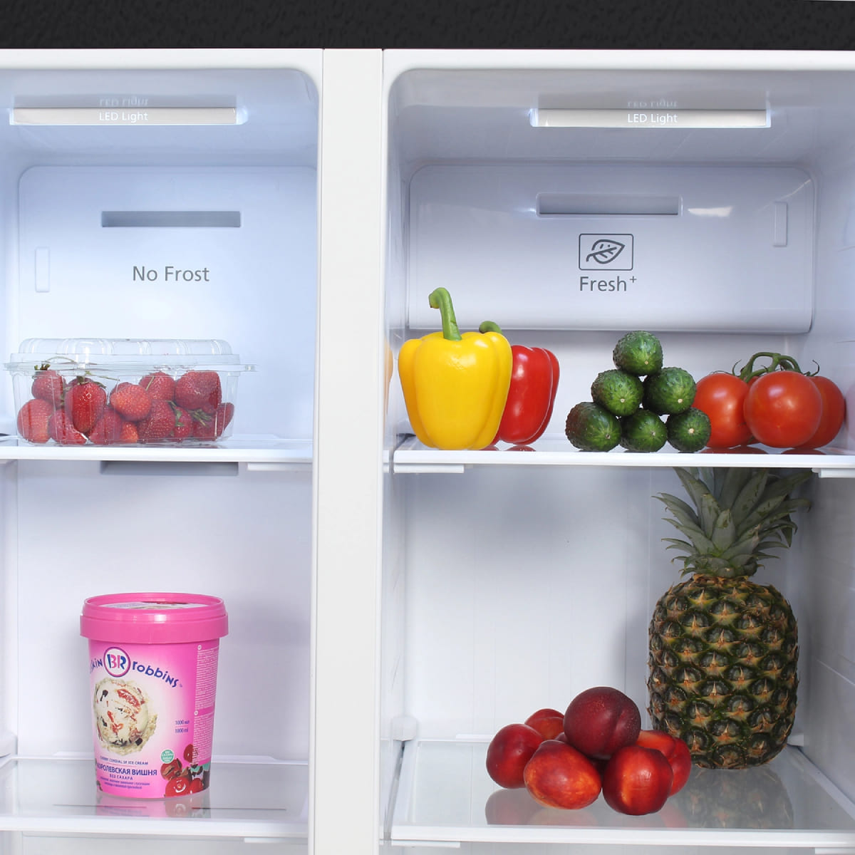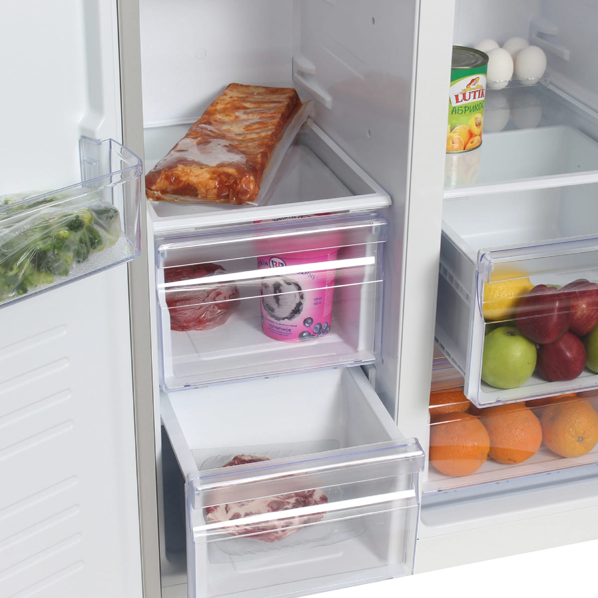 Данная модель — отдельностоящая, поэтому нужно тщательно подобрать место для ее размещения. Холодильник Side-by-Side с необычным расположением камер — сбоку друг от друга — позволяет увеличить объем продуктов для хранения. Такой вариант подходит обладателям просторной кухни, большим семьям, людям, которые запасают продукты и готовят впрок. Количество камер: 2.