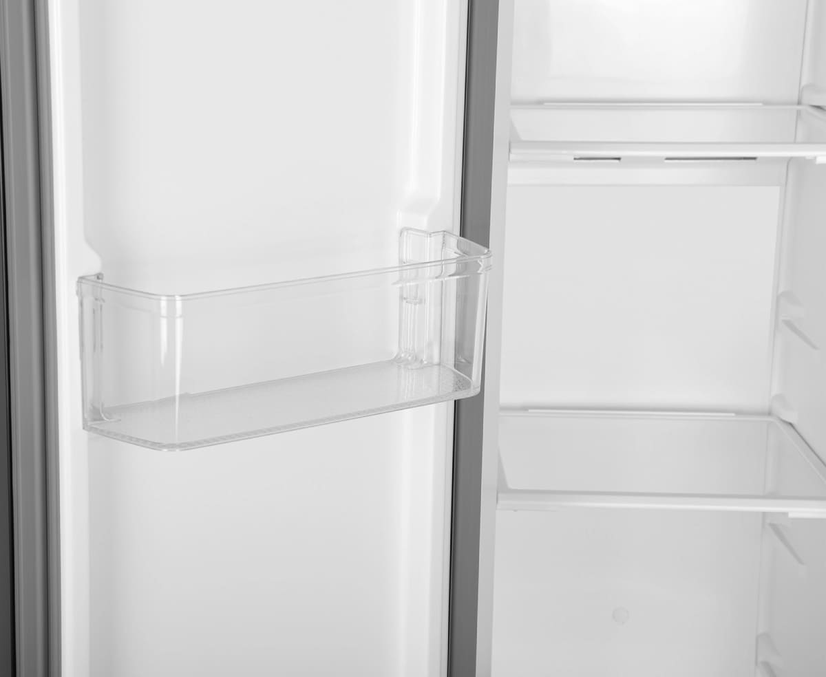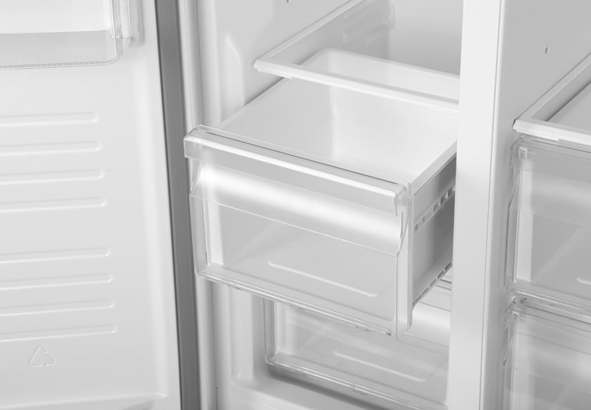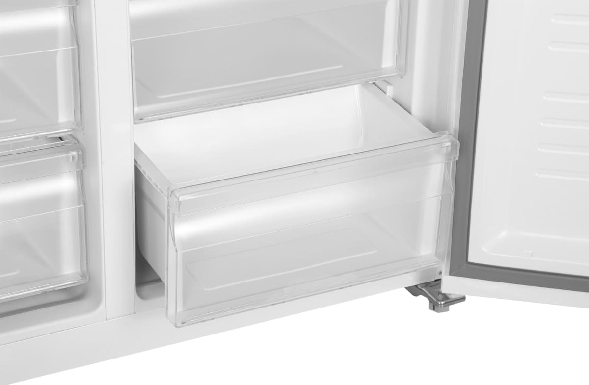 Данная модель — отдельностоящая, поэтому нужно тщательно подобрать место для ее размещения. Холодильник Side-by-Side с необычным расположением камер — сбоку друг от друга — позволяет увеличить объем продуктов для хранения. Такой вариант подходит обладателям просторной кухни, большим семьям, людям, которые запасают продукты и готовят впрок. Количество камер: 2.