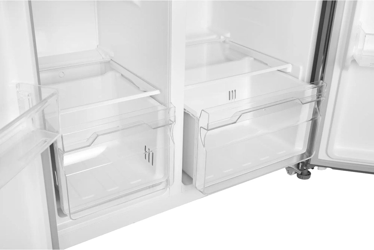 Данная модель — отдельностоящая, поэтому нужно тщательно подобрать место для ее размещения. Холодильник Side-by-Side с необычным расположением камер — сбоку друг от друга — позволяет увеличить объем продуктов для хранения. Такой вариант подходит обладателям просторной кухни, большим семьям, людям, которые запасают продукты и готовят впрок. Количество камер: 2.