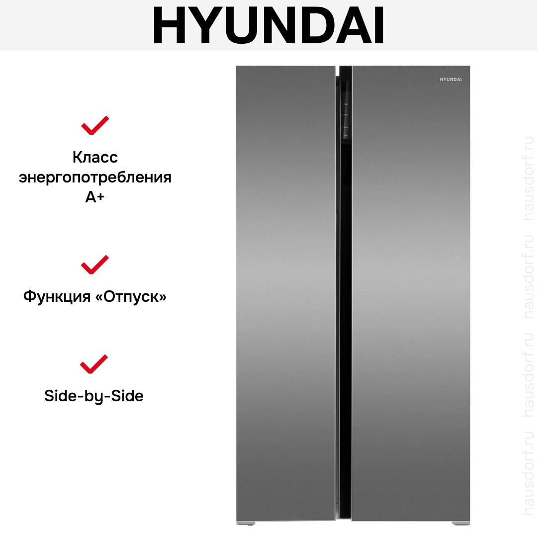 Холодильник Hyundai CS6503FV — отдельно стоящий агрегат вида side-by-side в корпусе из нержавеющей стали, который сочетает вместительность и строгий внешний вид.