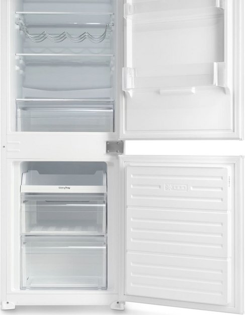 Встраиваемый прибор проще разместить в комнате, даже если общий метраж не такой уж большой. Вы можете спрятать его за декоративной панелью от мебельного фасада — советуем заранее определить нишу и заказывать панели исходя из типа крепления к двери. Вы можете поменять направление открывания двери, так как упор переставляемый и ее можно перевесить на другую сторону. Такая функция открывает больше возможностей для установки. Холодильник с морозильником обладает всеми опциями, которые чаще всего ищут и выбирают покупатели. Стандартная конфигурация — универсальный вариант для любой квартиры. Количество камер: 2.