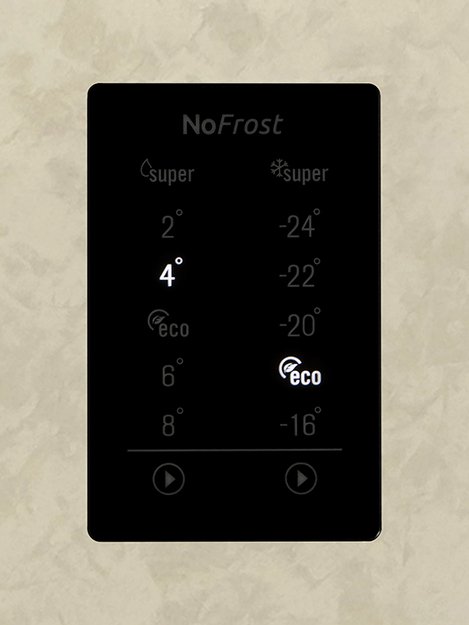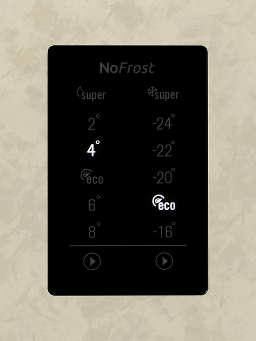 Гораздо точнее сориентироваться по индикаторам можно в холодильниках с электронной системой управления. Эти устройства обычно оснащены дисплеем, на котором высвечиваются значения фактической температуры в холодильной и морозильной камерах. Рядом с ними располагаются кнопки, во многих случаях сенсорные, при помощи которых можно регулировать температуру в каждой камере отдельно, и индикаторы включения этих камер. Здесь же, на панели инструментов, находятся индикаторы, указывающие на активацию дополнительных опций — например, режимов быстрого замораживания и быстрого охлаждения, отпускного режима, блокировки панели управления от детей.