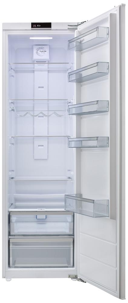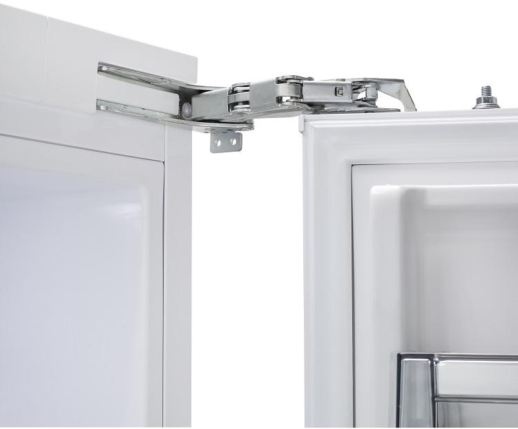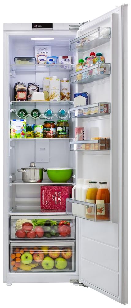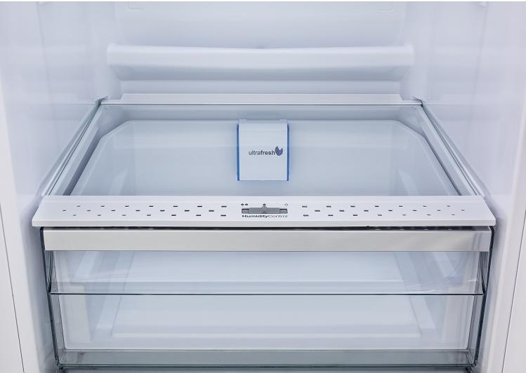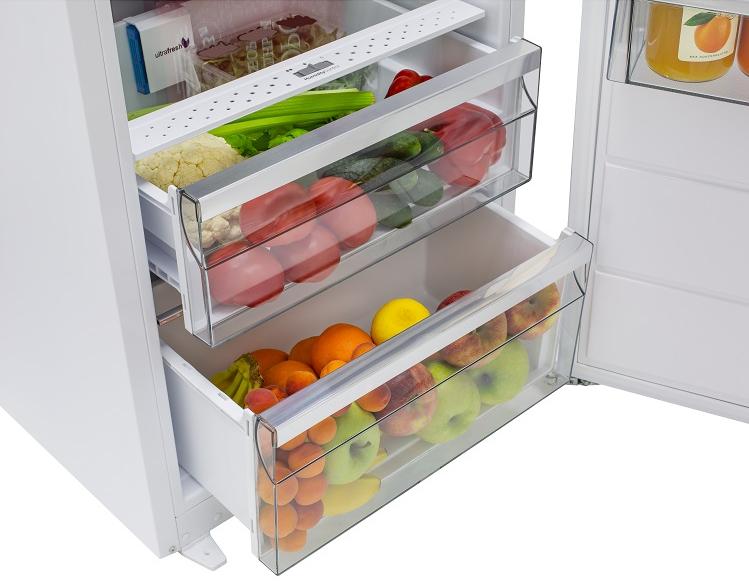 Холодильная камера встраивается в нишу и имеет крепление Door-on-Door. Полезный объем — 300 л. Внутри 9 полок (включая дверные) с хромированной окантовкой и два вместительных ящика для овощей фруктов и зелени. Имеется зона свежести, с помощью которой можно значительно продлить срок хранения овощей, фруктов, мясных и молочных продуктов, сохранив при этом все полезные свойства. В ней вы можете регулировать уровень влажности самостоятельно — достаточно сдвинуть рычажок вправо или влево.