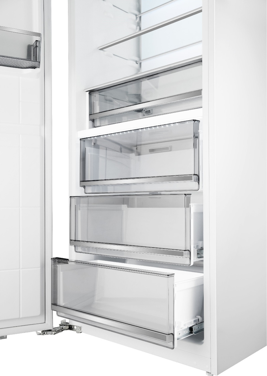 Встраиваемый прибор проще разместить в комнате, даже если общий метраж не такой уж большой. Вы можете спрятать его за декоративной панелью от мебельного фасада — советуем заранее определить нишу и заказывать панели исходя из типа крепления к двери. Способ монтажа в данной модели: скользящее крепление двери (система door sliding) Благодаря внушительным размерам, в частности высоте, она подходит большим пространствам — просторной кухне, еврогостиной. Вы можете поменять направление открывания двери, так как упор переставляемый и ее можно перевесить на другую сторону. Такая функция открывает больше возможностей для установки. Отдельную морозильную камеру чаще всего выбирают для частного дома или дачи, для производства, когда актуально хранение большого объема замороженных продуктов. Советуем обратить внимание на этот вариант. Количество камер: 1.