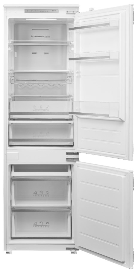 Холодильник Кортинг KSI 17780 CVNF общим объемом 243 литра в корпусе белого цвета оснащен электронной системой управления: панель с сенсорными кнопками и дисплеем находится в верхней части корпуса над дверцей. Система размораживания No Frost в обоих отделениях гарантирует удобный уход за внутренней поверхностью камеры, на которой не появляется иней и лед. Для размещения продуктов в холодильном отделении предусмотрены четыре регулируемые по высоте полки из закаленного стекла и подвесная полка для бутылок. В нижней части камеры находится большой ящик для овощей CrispBox с регулировкой влажности. В морозильном отделении продукты хранятся в прозрачных пластиковых контейнерах и на оригинальной выдвижной полке Sliding Tray. Производительность замораживания составляет 3 кг продуктов в сутки. Режимы суперохлаждения и суперзамораживания позволяют быстро понизить температуру в отделениях перед загрузкой в них большого объема свежих продуктов.