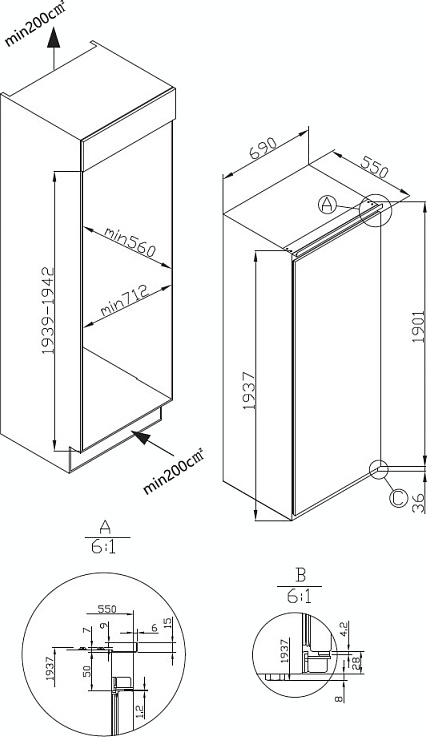 Встраиваемый прибор проще разместить в комнате, даже если общий метраж не такой уж большой. Вы можете спрятать его за декоративной панелью от мебельного фасада — советуем заранее определить нишу и заказывать панели исходя из типа крепления к двери. Способ монтажа в данной модели: скользящее крепление двери (система door sliding) Благодаря внушительным размерам, в частности высоте, она подходит большим пространствам — просторной кухне, еврогостиной. Вы можете поменять направление открывания двери, так как упор переставляемый и ее можно перевесить на другую сторону. Такая функция открывает больше возможностей для установки. Холодильник без морозильной камеры имеет свои преимущества: больше места для хранения продуктов краткого срока годности, разнообразие полок и ящиков для овощей, фруктов, молочных изделий. Количество камер: 1.