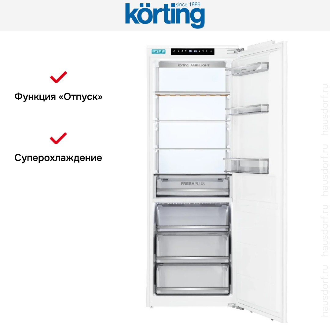 Встраиваемый холодильник Korting KSI 1935 — это вместительная и продуманная модель, разработанная для аккуратной интеграции в мебельный гарнитур. Панель под фасад сохраняет единый стиль кухни без видимых элементов техники. Параметры корпуса 193.7×69×55 см и размеры ниши для встраивания 194.2×71.2×56 см дают точное понимание требований к монтажу. Общий объем 337 литров обеспечивает достаточный запас для всех, кто любит закупаться про запас. Дверной упор справа можно перевесить, чтобы агрегат открывался в другую сторону.