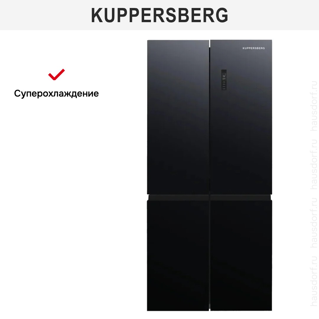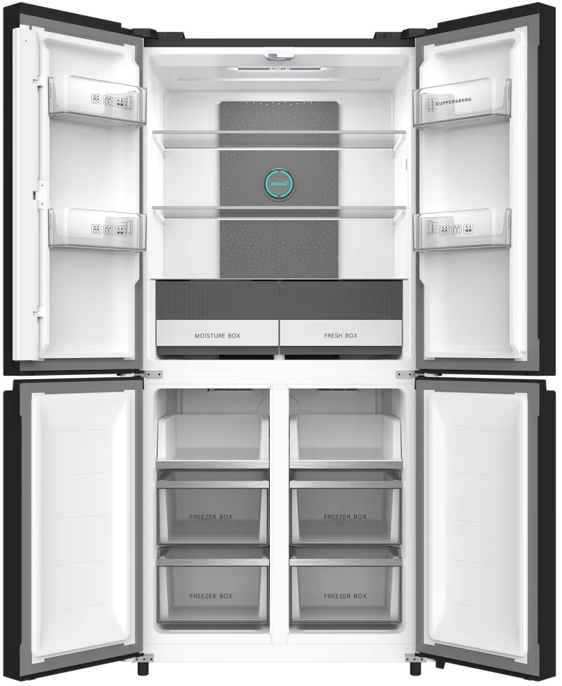 Kuppersberg NFFD 186 BG — современный многозадачный прибор, подчёркивающий стиль и функциональность на кухне за счёт глубокого чёрного стеклянного фронта и лаконичных линий корпуса высотой 182.2 см. Этот отдельно стоящий агрегат с нижним расположением морозильного отсека объединяет два объёма — общая полезная вместимость 475 л, из которых холодильная камера даёт 303 л для овощей, напитков и повседневных запасов, а фризер предлагает 172 л для длительного хранения. Дизайн продуман до мелочей: четыре двери и конструкция Side-by-Side обеспечивают удобный доступ к отделениям, а стеклянные полки, две из которых регулируемые и одна стационарная, гарантируют простую организацию продуктов. На дверях расположены четыре практичных полки, имеется лоток для яиц и две ёмкости в зоне свежести, где оптимальные условия для мясных и овощных продуктов поддерживаются отдельно. Внутренняя LED-подсветка равномерно освещает пространство, подчёркивая аккуратный интерьер и упрощая поиск нужного элемента. За надёжное и тихое охлаждение отвечает инверторный компрессор с циркуляционной системой и хладагентом R600a, что обеспечивает экономичное потребление энергии класса A++ и уровень шума всего 41 дБ — идеальное сочетание мощности и бесшумности. Управление реализовано электронно: сенсорные кнопки и цифровой дисплей позволяют точно задавать температуру, активировать режим суперохлаждения в холодильной части и функцию суперзамораживания в морозильнике для быстрой фиксации свежести. Система No Frost в обеих камерах исключает образование наледи и экономит время на обслуживании, а способность замораживать до 8 кг в сутки и рабочий диапазон от −15°C до −24°C делают прибор надёжным помощником при большой загрузке. Практичная планировка фризера включает две верхние полки и четыре глубоких ящика для удобной укладки полуфабрикатов, мяса и заготовок; наличие лотка для льда добавляет комфорта в использовании. Прибор адаптирован к климатическому классу ST и рассчитан на питание от сети 220-240 В при частоте 50 Гц, ток 10 А; регулируемые ножки позволяют установить аппарат ровно на любой поверхности. Встроенные сигналы и звуковая индикация предупреждают об оставленной открытой двери, а функция блокировки от детей обеспечивает дополнительную безопасность в доме. Такой холодильник сочетает в себе вместительность, удобную организацию хранения и современные технологии контроля микроклимата, позволяя оптимально распределять продукты и поддерживать их качество с минимальными усилиями со стороны пользователя.