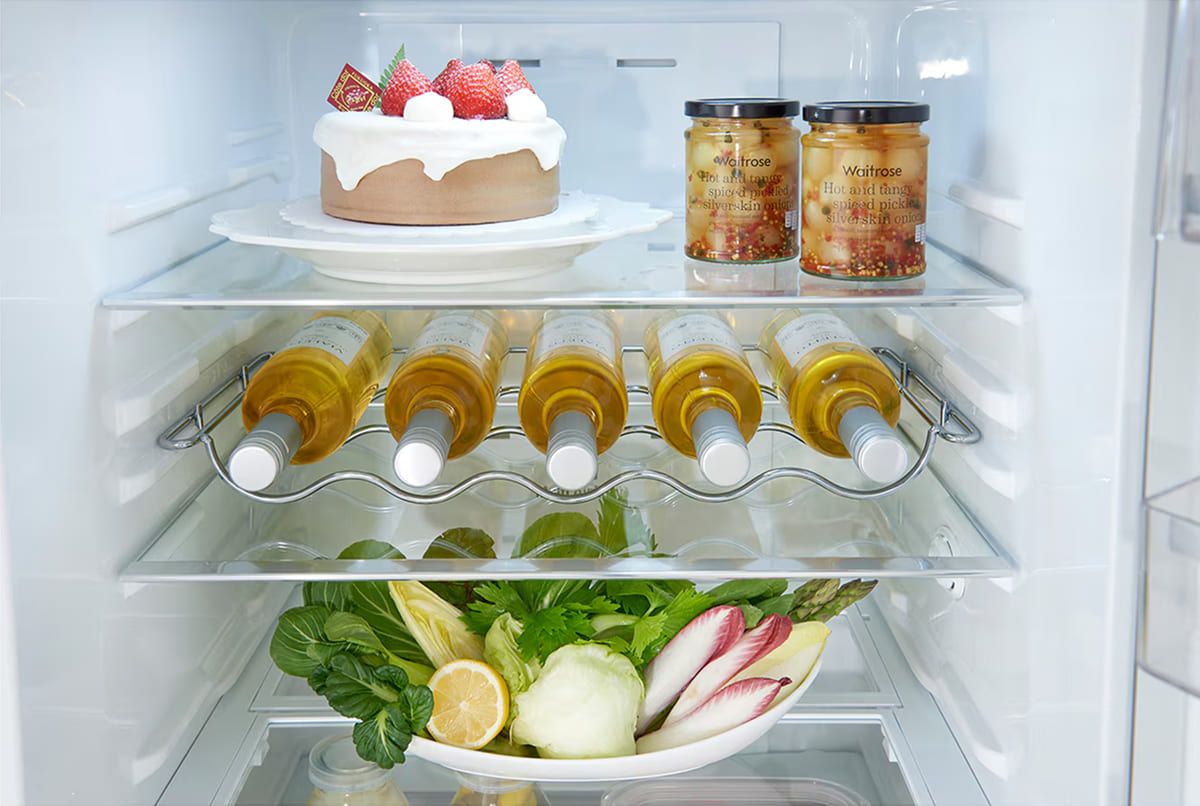 Полки в отделении бывают нескольких типов. Чаще всего встречаются полки из закаленного или ударопрочного стекла. Закаленное стекло выдерживает особенно большие нагрузки до 25 кг, так что на них можно устанавливать посуду из любого материала. Стекло является безопасным нейтральным материалом, не желтеет и не портится со временем, а также быстро и легко моется. Для того чтобы предотвратить проливание жидкости, полки оснащаются металлической или пластиковой окантовкой.