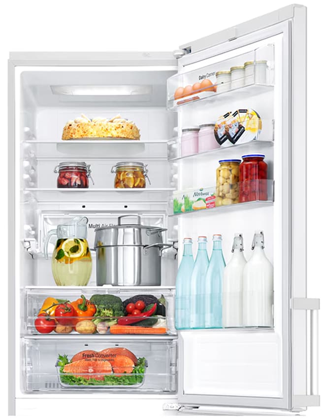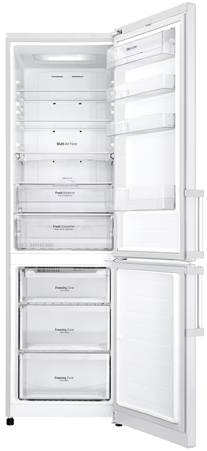 Специальная зона свежести предназначена для правильного и более длительного хранения овощей, фруктов, зелени. В ней поддерживается околонулевая температура, поэтому продукты не перемораживаются и не пересыхают. Система охлаждения этого холодильника — Multi-Airflow-System.