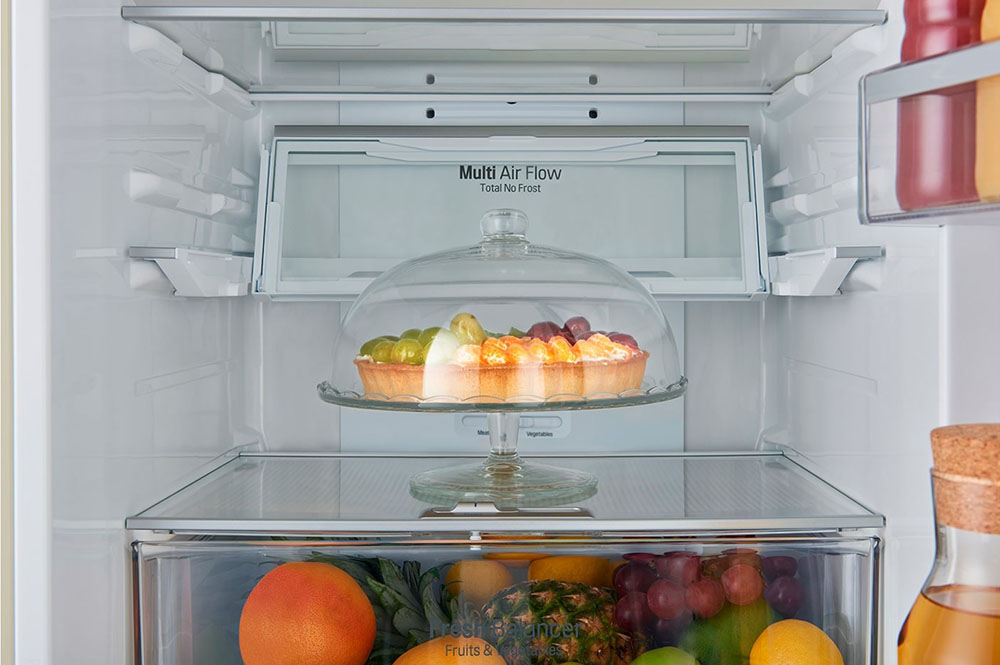 Специальная зона свежести предназначена для правильного и более длительного хранения овощей, фруктов, зелени. В ней поддерживается околонулевая температура, поэтому продукты не перемораживаются и не пересыхают. Система охлаждения этого холодильника — Multi-Airflow-System.