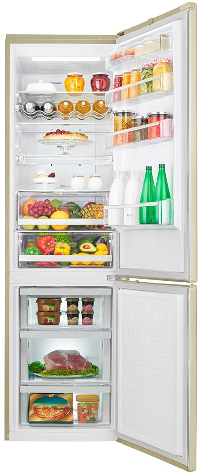 Внутреннее наполнение холодильной и морозильной камер включает многочисленные и разнообразные полки, ящики, контейнеры. Все они используются для более удобного и рационального размещения продуктов, которое обеспечивает хороший обзор содержимого холодильника и быстрый поиск.