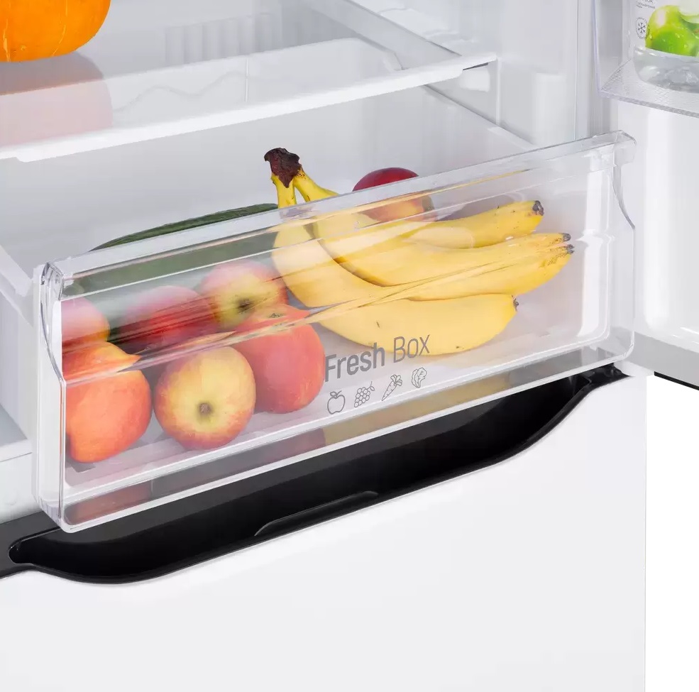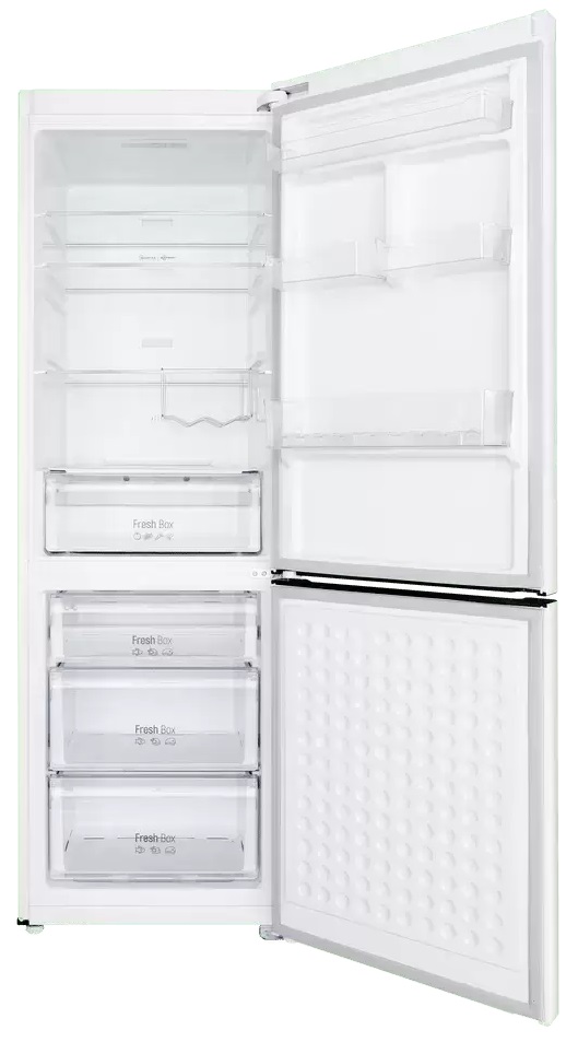 Внутреннее пространство рассчитано на 330 л общего объёма: 232 л холодильной части и 98 л морозильной камеры. Четыре полки из закалённого стекла выдерживают значительную нагрузку и легко чистятся от пролившихся жидкостей. На дверце расположены четыре вместительных балкона для напитков и соусов, а в основной части есть один большой ящик и два контейнера для овощей и фруктов. Зона свежести поддерживает оптимальную влажность для мяса и рыбы, что продлевает срок годности продуктов без потери текстуры и вкуса.