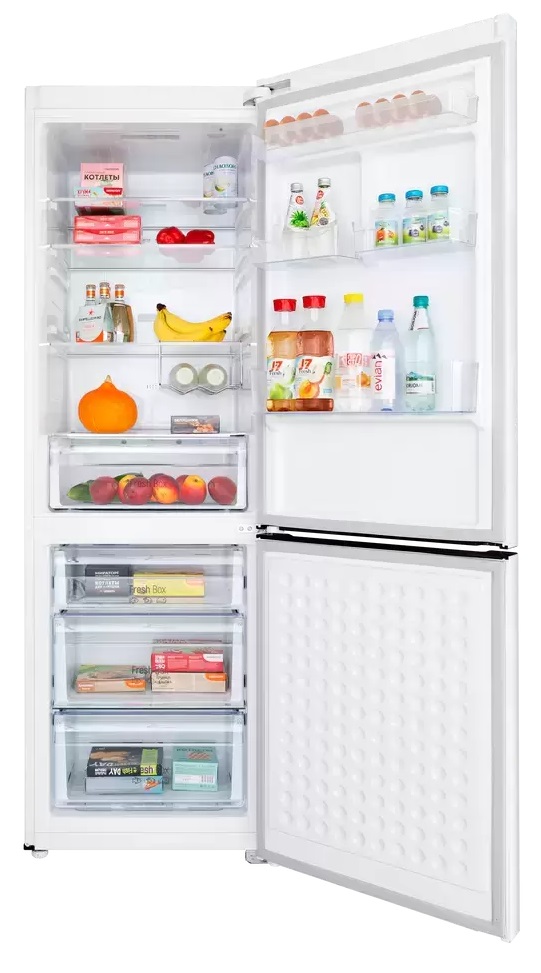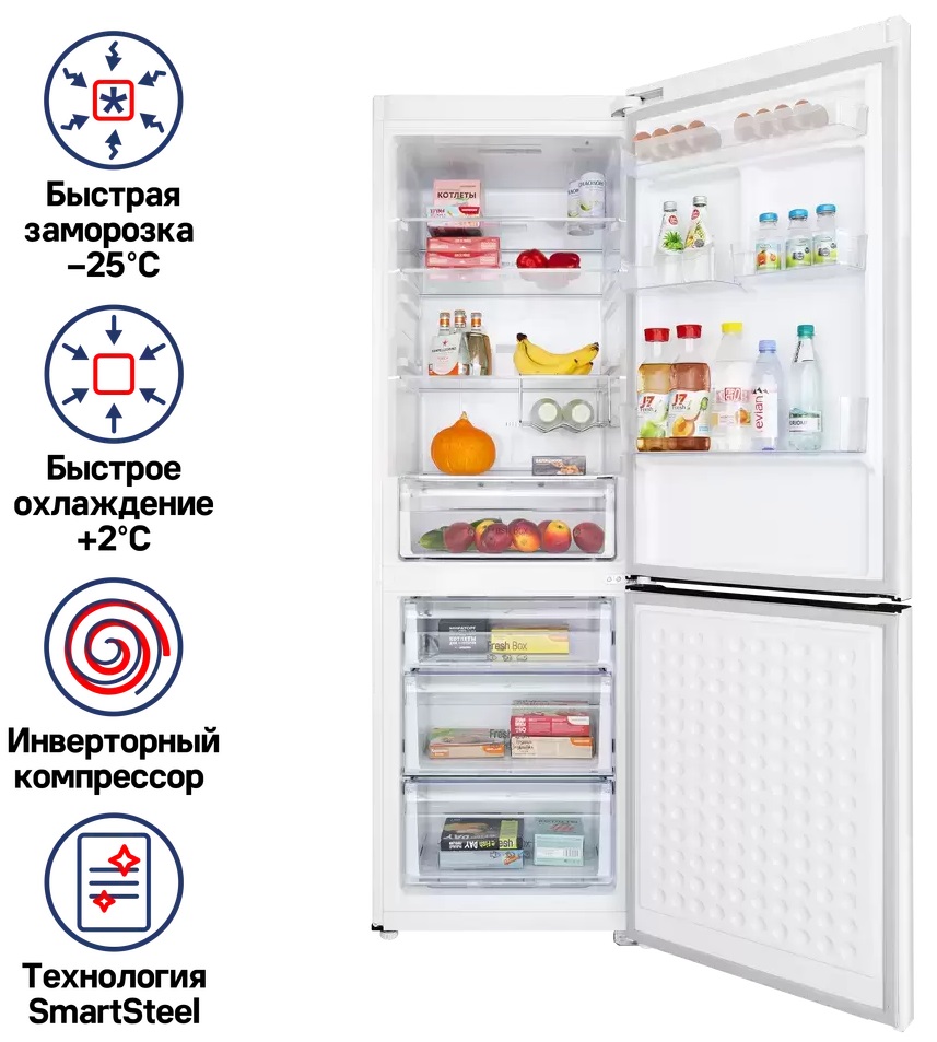 Система No Frost в обеих камерах исключает образование инея и избавляет от необходимости регулярного ручного размораживания. Электронное управление с сенсорными кнопками и цифровым дисплеем обеспечивает точную настройку температур и индикацию статуса работы. Функции суперохлаждения и суперзамораживания ускоряют снижение температуры после загрузки тёплых продуктов, что сохраняет структуру клеток и питательные вещества. Лоток для льда и три выдвижных ящика в морозильной части делают хранение и сортировку полуфабрикатов удобными.