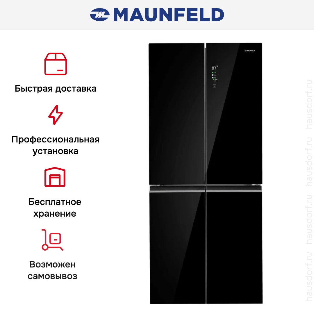 Холодильник Maunfeld MFF192NFB01 Inverter представлен как отдельно стоящая многокамерная модель с нижней морозильной камерой и дверным упором FrenchDoor, выполненная в строгом черном цвете и имеющая габариты 191×83.3×64 см.