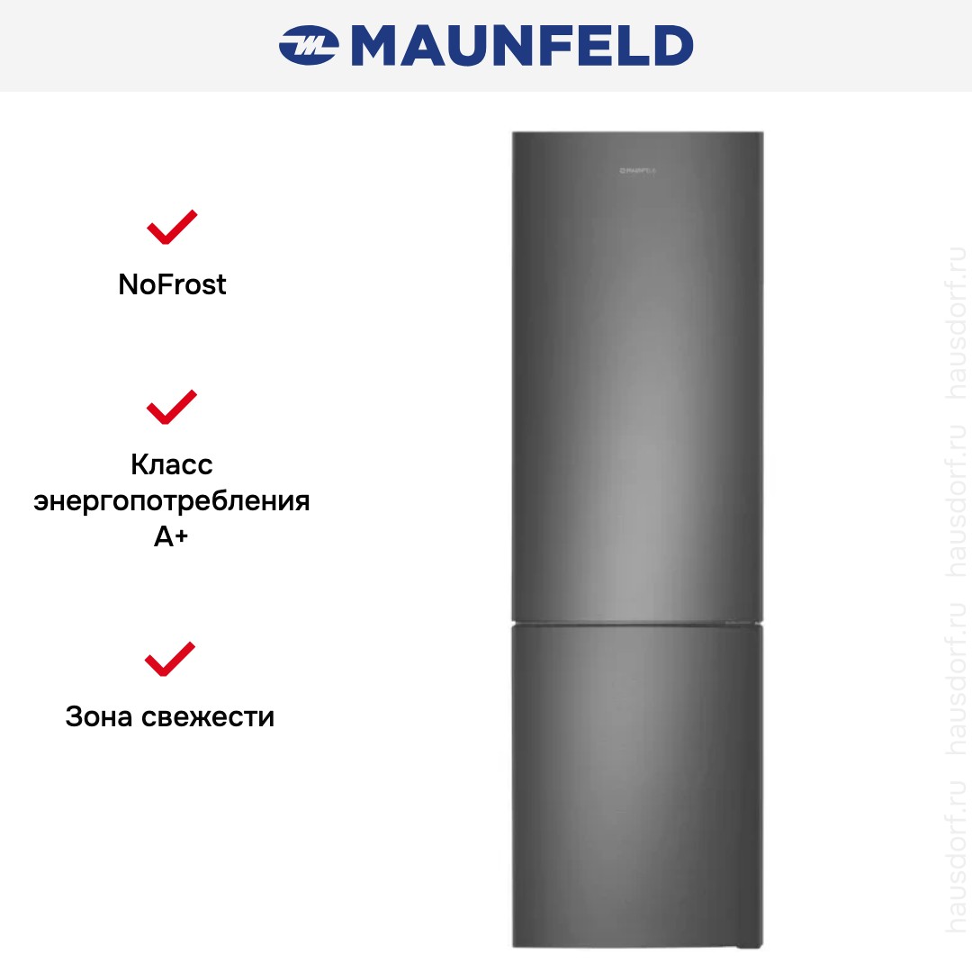 Холодильник Maunfeld MFF200NFSTSE представляет собой отдельно стоящую двухкамерную модель с морозильной камерой в нижней части, выполненную в оттенке нержавеющей стали. Высота 200 см и ширина чуть менее 60 см обеспечивают внушительный внутренний объём при экономии кухонного пространства. Правая сторона дверного упора и продуманная глубина 62,5 см упрощают установку возле стен и встраивание между мебелью без изменения дизайна интерьера.