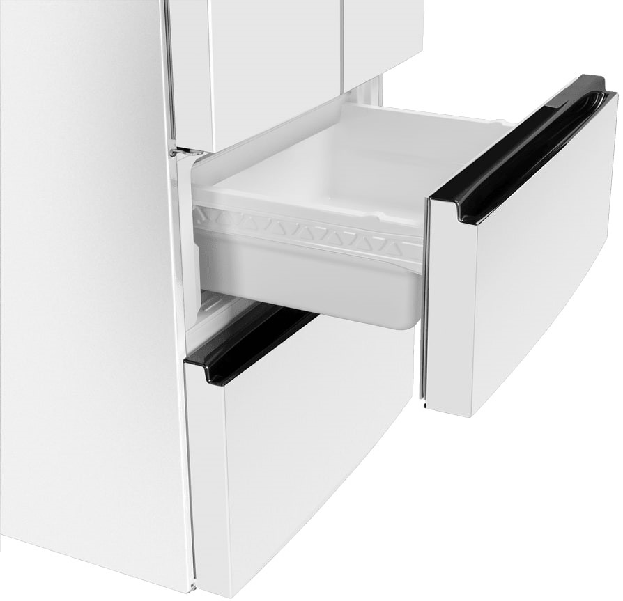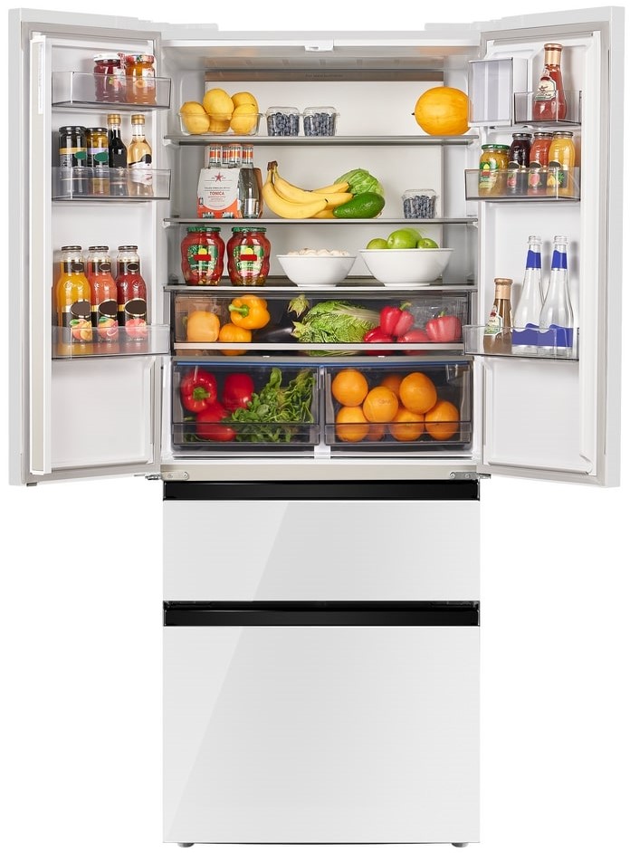 Холодильник Maunfeld MFF190NFD PW01 — отдельно стоящий двухкамерный агрегат необычной конструкции French Door. Холодильное отделение располагается сверху и имеет две створки дверей, а морозильник находится снизу и включает два выдвижных ящика. Габариты прибора 190,5×83×60 см делают его удобным для кухонь средней и большой площади. Общий полезный объем 508 литров обеспечивает комфортное хранение запасов на большой срок для семьи.