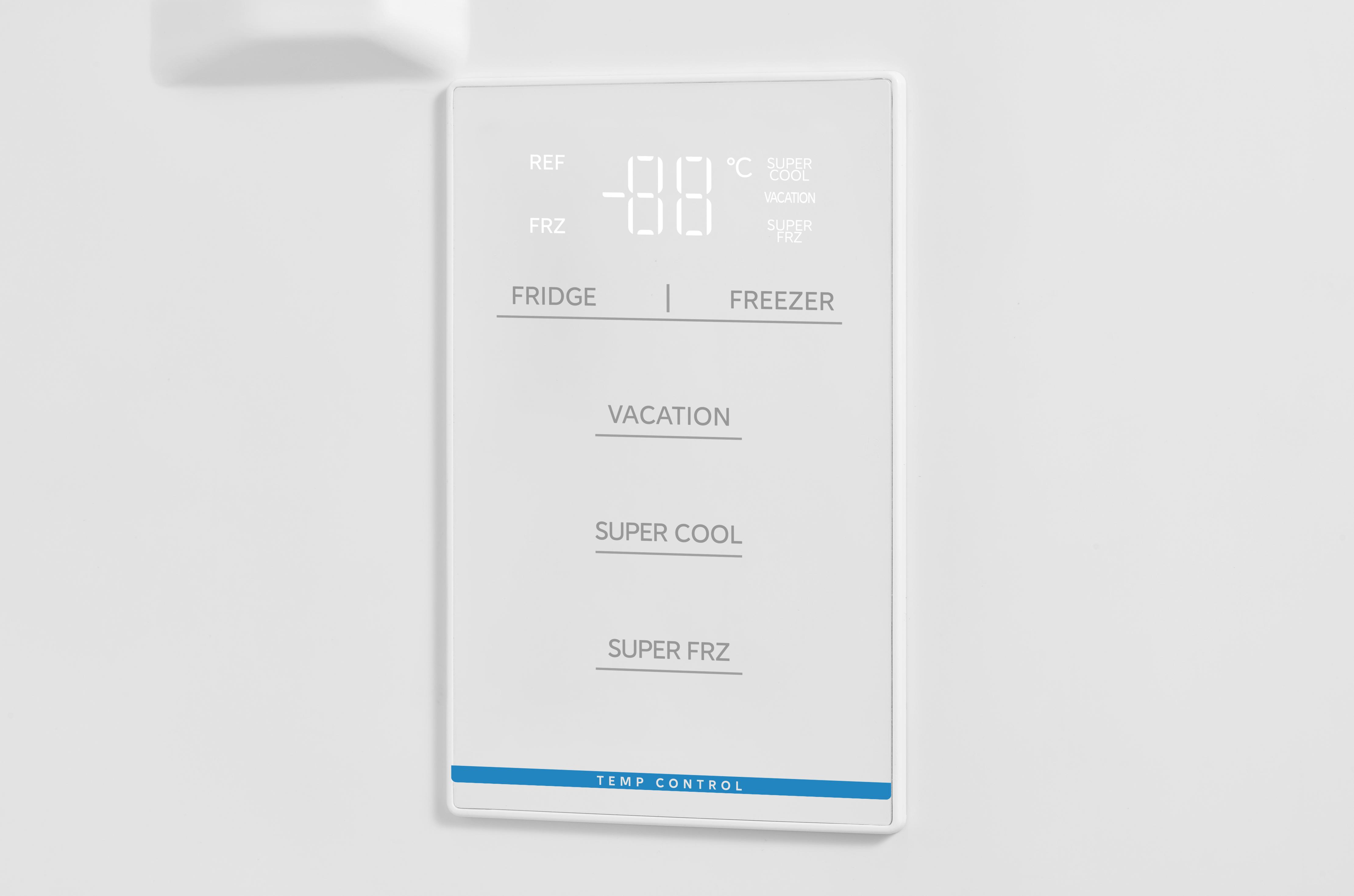 Гораздо точнее сориентироваться по индикаторам можно в холодильниках с электронной системой управления. Эти устройства обычно оснащены дисплеем, на котором высвечиваются значения фактической температуры в холодильной и морозильной камерах. Рядом с ними располагаются кнопки, во многих случаях сенсорные, при помощи которых можно регулировать температуру в каждой камере отдельно, и индикаторы включения этих камер. Здесь же, на панели инструментов, находятся индикаторы, указывающие на активацию дополнительных опций — например, режимов быстрого замораживания и быстрого охлаждения, отпускного режима, блокировки панели управления от детей.