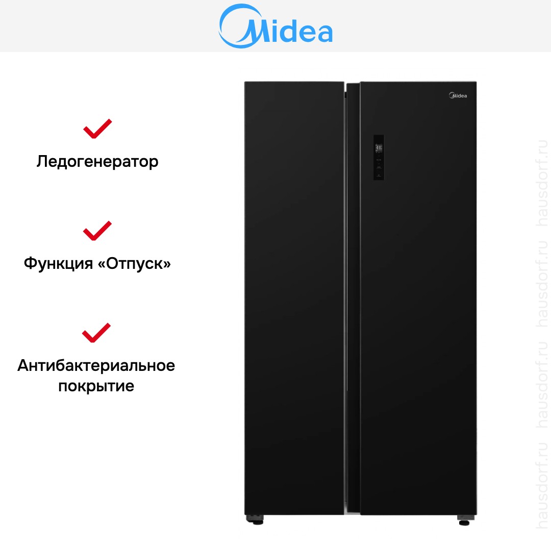 Холодильник Midea MDRS710FGE30 — стильный отдельно стоящий агрегат формата Side-by-Side в глубоком черном цвете. Его строгая фронтальная панель и аккуратные вертикальные двери создают эффект современной встроенной мебели. Габариты 176.5×89.7×70.6 см обеспечивают внушительное присутствие, не теряя пропорций в стандартной кухне. Матовая поверхность и минималистичный дисплей подчеркивают премиальный характер корпуса.