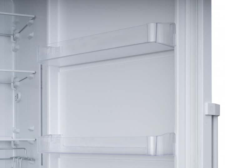 Для стеклянных бутылок, особенно винных и содержащих другие алкогольные напитки, предусматривается размещение на подвесной решетчатой металлической полке. Бутылки на ней располагаются в горизонтальном положении — это оптимальный способ хранения вин. Съемная металлическая полка легко моется под краном.