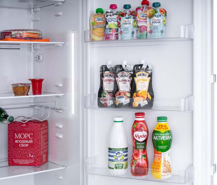 В нижней части обычно располагается полка, или балкон, для хранения бутылок. Выше имеется несколько полок для размещения консервов, йогуртов и тому подобных продуктов в таре из разных материалов. На самом верху располагаются закрытые полки, в которых можно хранить такие продукты, как яйца в специальных подставках, масло, сыр.