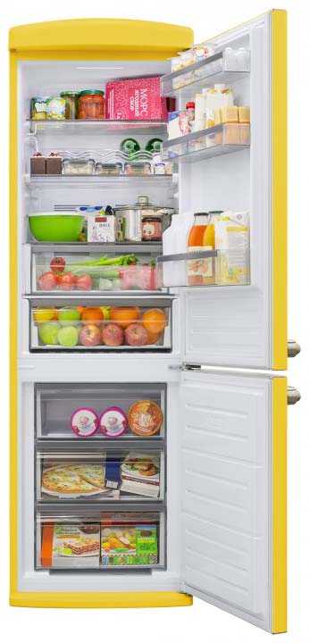 Цвет холодильника — один из значимых факторов, влияющих на его выбор. Традиционно самым популярным цветом для бытовых приборов считается белый. Это универсальный цвет, который гармонирует со всеми другими оттенками, он подойдет для кухонь любого размера, а в небольших помещениях светлые тона способны зрительно раздвинуть пространство. Белая техника достаточно проста в уходе, а производители предлагают большой ассортимент холодильных устройств, в том числе с фасадами из стекла, эмали, окрашенного металла.