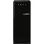 Холодильник Smeg FAB28LBL6. Как продавец-консультант отмечу, что это отдельностоящая модель с верхней морозильной камерой, выполненная в узнаваемом стиле 50-х годов и эффектном черном цвете. Внешняя ручка и левая сторона дверного упора подчеркивают винтажную эстетику, а при этом сохраняют удобство повседневного использования. Габариты 153×60.1×72.8 см делают прибор компактным вариантом для кухни средней площади, но при этом внутренняя вместимость вполне достаточна для семьи из двух-трех человек.