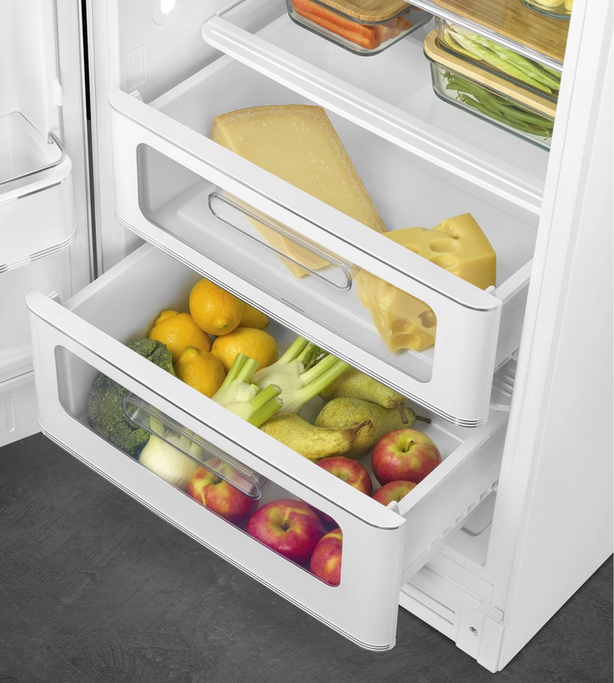 Вместительные контейнеры позволяют хранить достаточное количество овощей и фруктов. Для более длительного хранения и поддержания свежести овощей и фруктов разработаны специальные системы хранения. Среди них, например, зона свежести с увеличенной влажностью до 85% и температурой около 0 градусов. Это герметично закрывающийся ящик, часто на выдвижных роликах или направляющих, в котором имеется специальное задвижка, позволяющая регулировать влажность. Как известно, при более высокой влажности продукты с большим содержанием воды дольше остаются свежими.