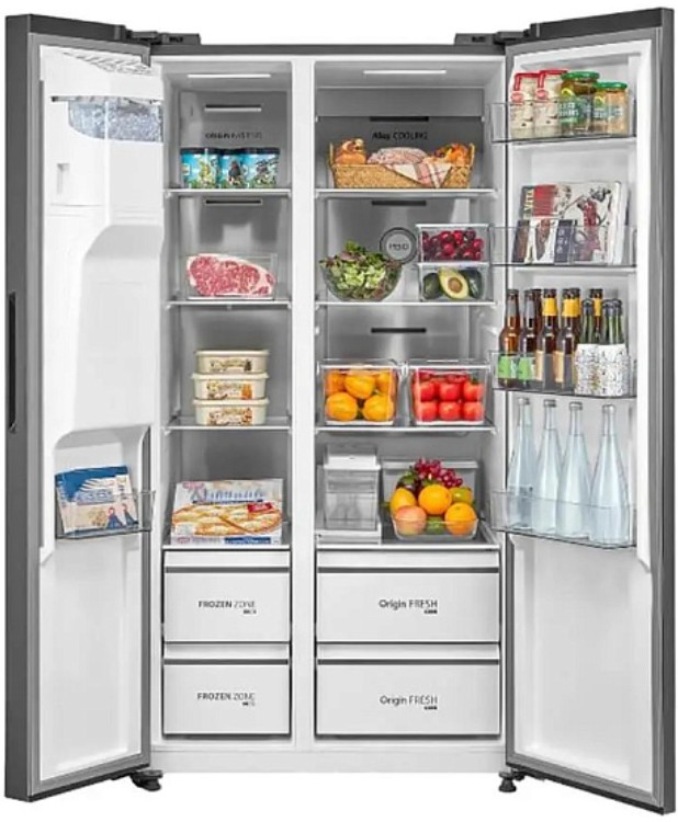 Отдельно стоящая двухкамерная модель Side‑by‑Side общим объёмом 636 л, где холодильная секция рассчитана на 380 л полезного пространства, а морозильная — на 202 л. Сенсорная панель и дисплей на дверце дают быстрый контроль параметров, а управление через мобильное приложение позволяет менять настройки удалённо. Инверторный компрессор на один контур с хладагентом R600a обеспечивает стабильную работу, а система Multi‑Airflow равномерно распределяет холод по полкам. LED‑подсветка в обеих камерах делает внутреннее пространство визуально просторнее и помогает быстро находить продукты.