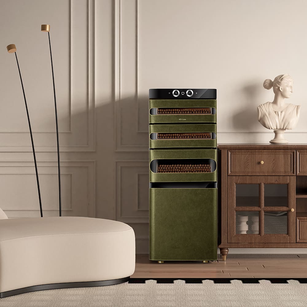 Установлен на воздуховоде, чтобы удалять примеси и запахи, которые могут нарушить выбранные условия хранения сигар.