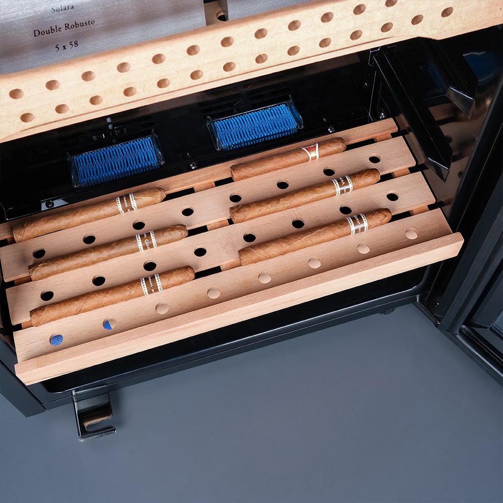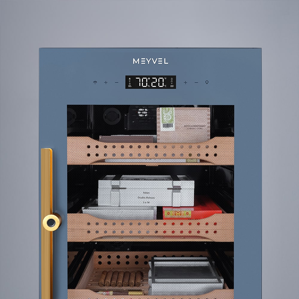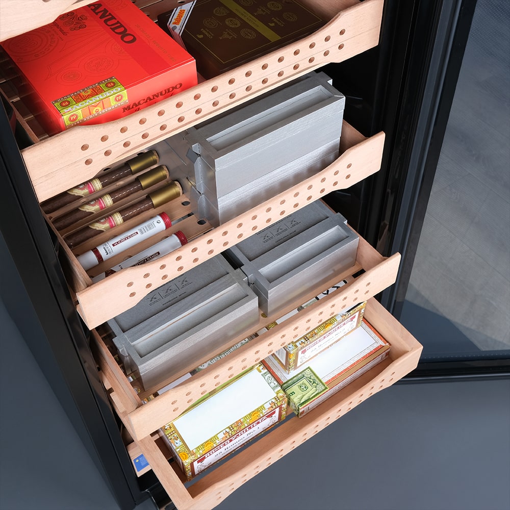 Небольшая высота и ширина позволяют вписать хьюмидор в жилую комнату или небольшое коммерческое пространство, правый дверной упор удобен при расположении рядом с мебелью, а шесть полок из испанского кедра — простая система для аккуратной укладки. Сенсорное управление и индикаторы сокращают время настройки, а двойное стекло с УФ‑защитой сохраняет качество и защищает от внешнего света. Равномерный поток воздуха за счёт вентилятора и динамического охлаждения уменьшает перепады параметров внутри.