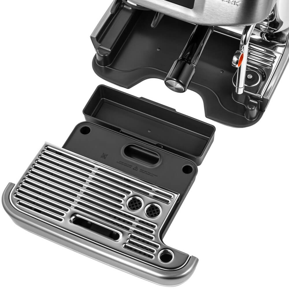 Съемный лоток для сбора капель (каплесборник) позволяет защитить столешницу от капель, которые могут попасть на нее при удалении чашки с напитком с подставки. Это плоский резервуар из пластика, который находится под решетчатой подставкой и легко выдвигается для очистки. Подсчитано, что в автоматической кофемашине в лоток попадает 15-40 мл воды за одно приготовление. Офисные модели, таким образом, должны иметь больший объем лотка, чем домашние. О заполнении этого резервуара оповещает либо специальный индикатор на панели управления, либо соответствующее сообщение на дисплее.