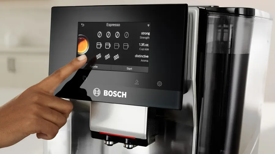 Регулирование крепости кофе в кофемашинах Bosch позволяет приготовить напиток соответствующего вкуса, изменяя количество молотого кофе и время его заваривания. Можно настроить крепость напитка в диапазоне от очень слабого до очень крепкого кнопками сенсорного меню или поворотом переключателя.