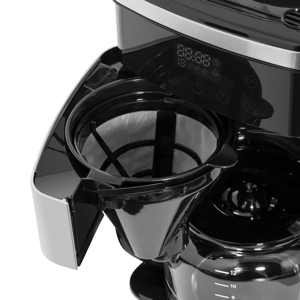 Габариты прибора — 42,5 см в высоту, 20,7 см в ширину и 31,2 см в глубину — продуманы так, чтобы вместить увеличенный объём воды и кофе, не занимая при этом много места на столешнице. Вертикальная компоновка делает модель особенно удобной для размещения под навесными шкафами, а узкий профиль позволяет вписать её даже в компактные кухонные зоны. Несмотря на вытянутую форму, кофеварка сохраняет устойчивость и эргономичность: прозрачный резервуар с чёткой шкалой объёма, съёмная воронка для фильтра и вместительная колба обеспечивают лёгкость в эксплуатации и уходе.