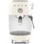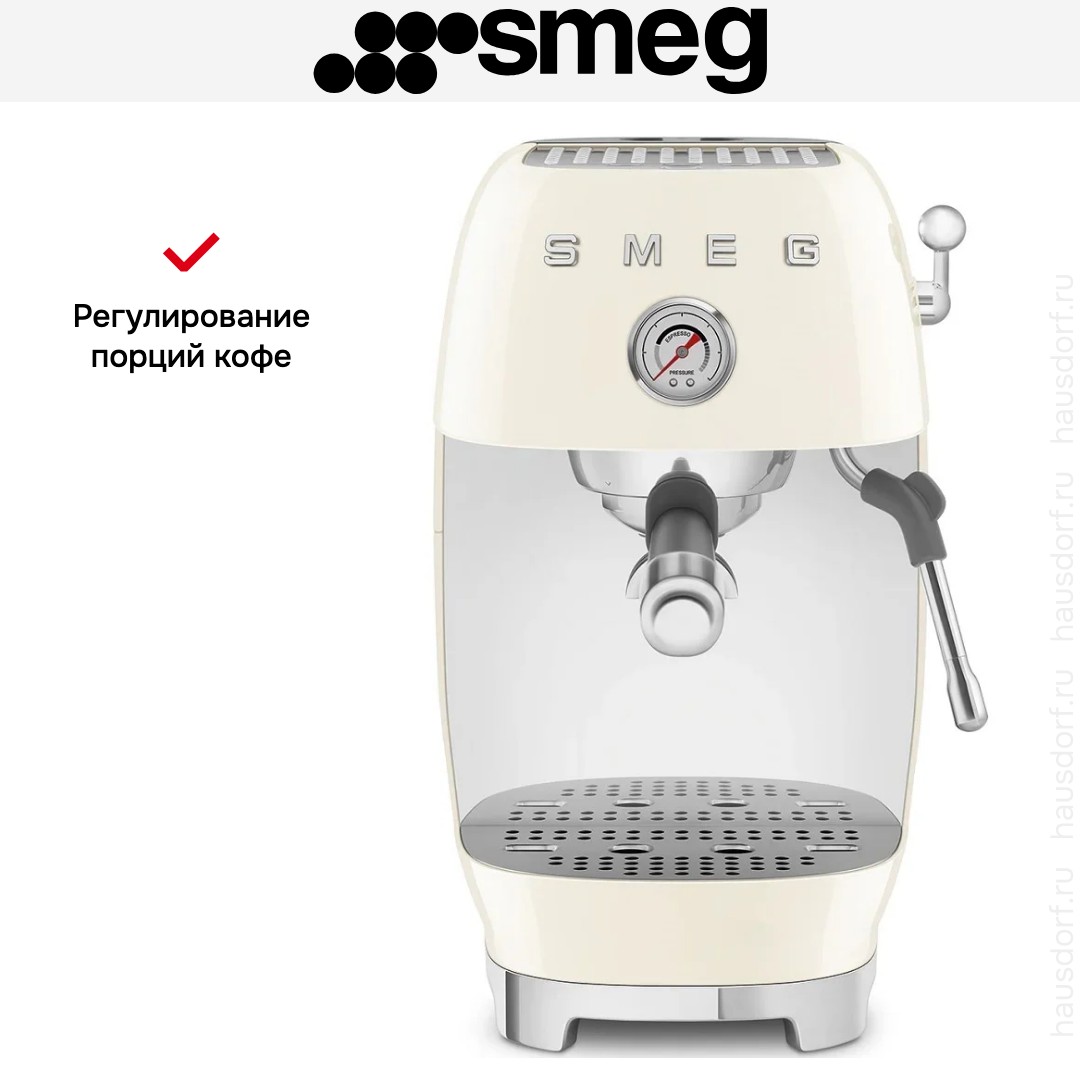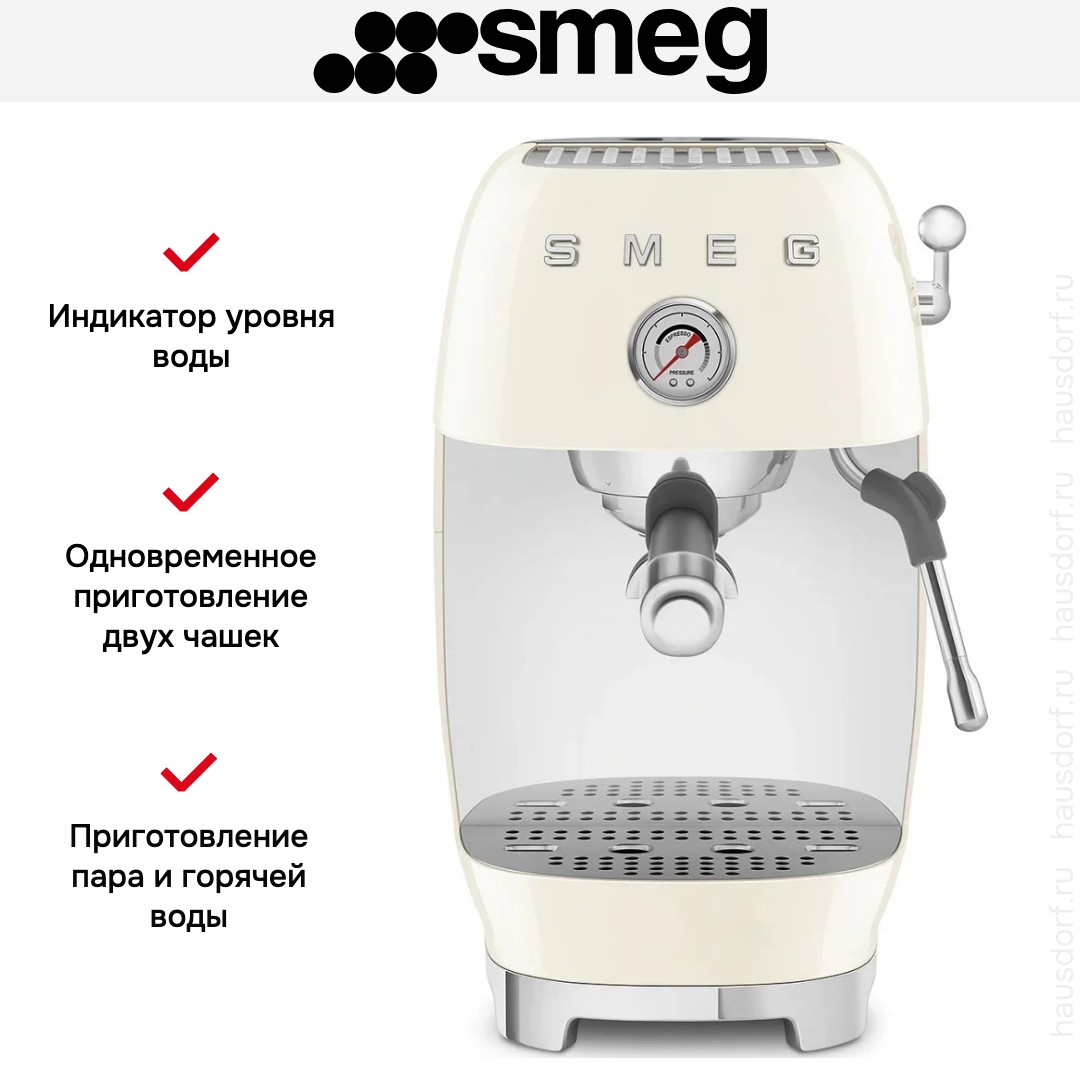 Кофемашина выглядит как предмет из кухни прошлых десятилетий: облицовка в кремовом цвете и плавные округлые формы подчёркивают стиль 50-х годов. Компактные габариты — высота 36.4 см, ширина 20.5 см, глубина 29.5 см — делают аппарат заметным акцентом, но не громоздким. Панель управления объединяет кнопочные и поворотные переключатели, а металлический рожок добавляет контраста на фоне пластикового корпуса.