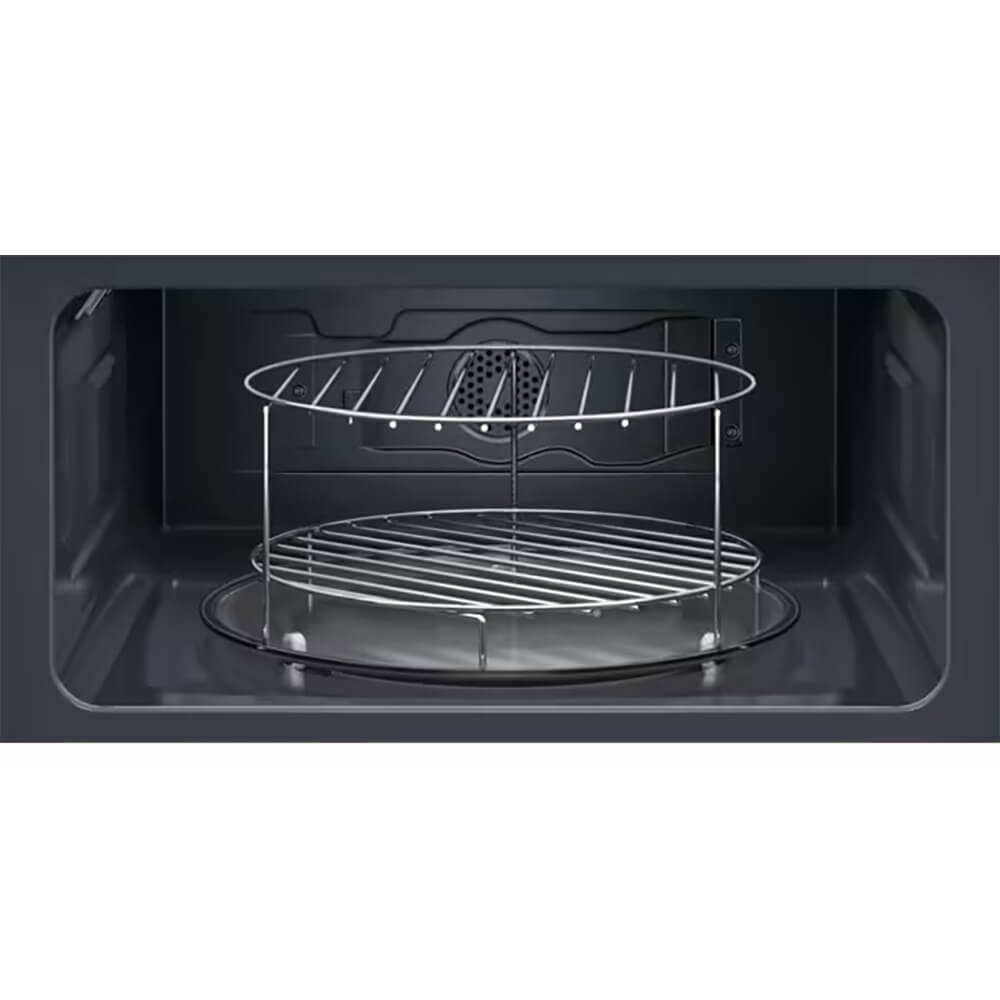 Материал внутренней поверхности — эмаль легкой очистки. Полезный объем для готовки — 44 л. Для установки и прогрева посуды используется классическое вращающееся блюдо. В комплекте также есть решетка, с помощью которой можно разнообразить привычное меню. Понятное электронное управление не вызовет трудностей ни у кого из вашей семьи. Для изменения настроек или выбора программ используются следующие переключатели: сенсорные.