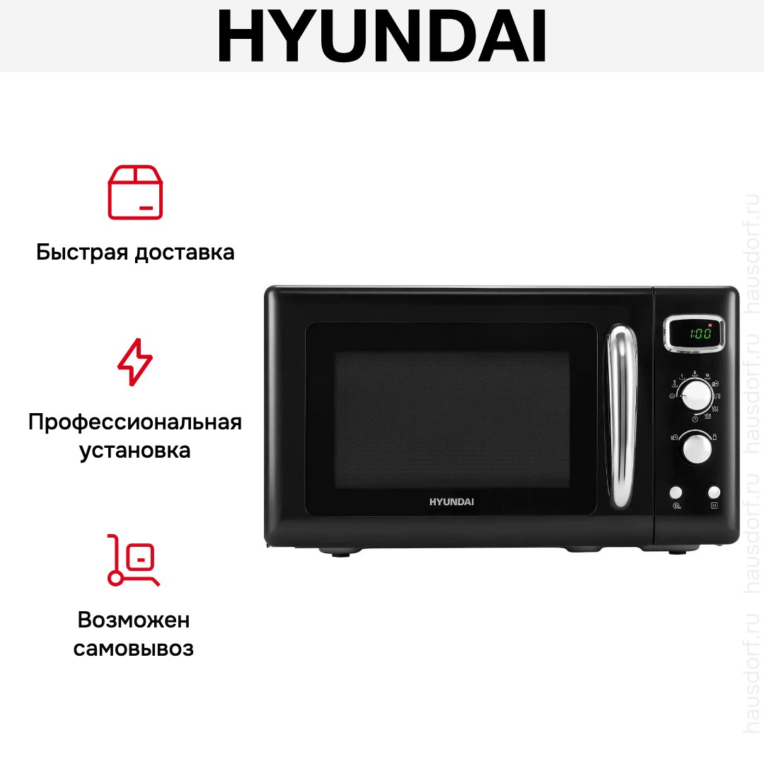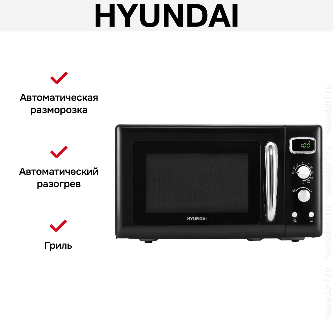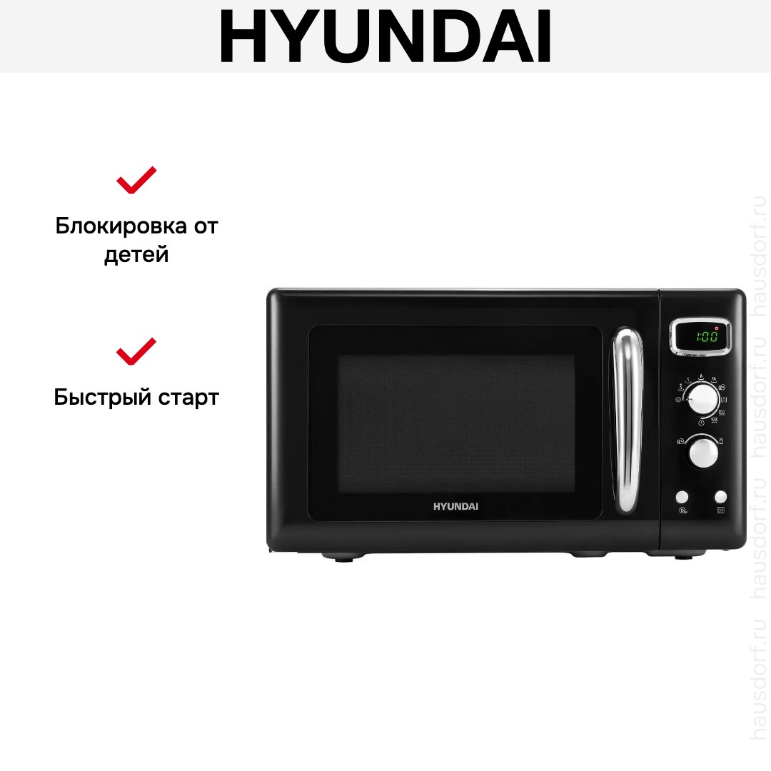 Количество режимов в данной модели Хендай: 9 шт. Для обработки продуктов и готовых блюд используются следующие виды нагрева: Микроволны, Гриль, Микроволны + гриль, Автоматический режим разморозки, Автоматический режим приготовления. Выберите гриль, чтобы получить поджаристую корочку на мясе или рыбе. Если вы спешите, а еду нужно разогреть, используйте быстрый старт — благодаря ему 30 секунд прибор работает на полной мощности. Отдельная опция для размораживания продуктов и полуфабрикатов облегчает жизнь — не нужно самостоятельно настраивать параметры. Автоматические программы для приготовления добавлены производителем также для упрощения работы.