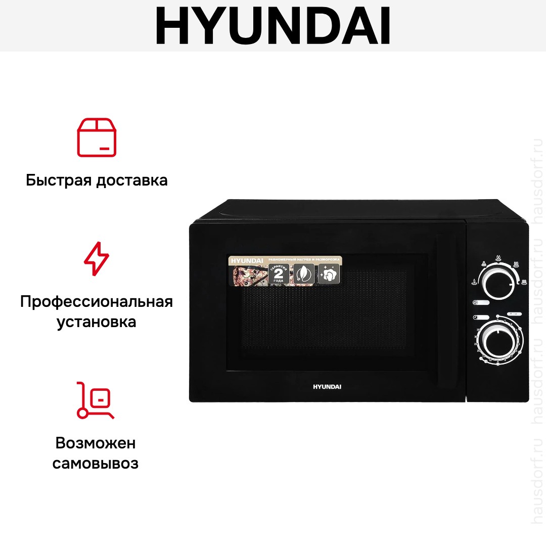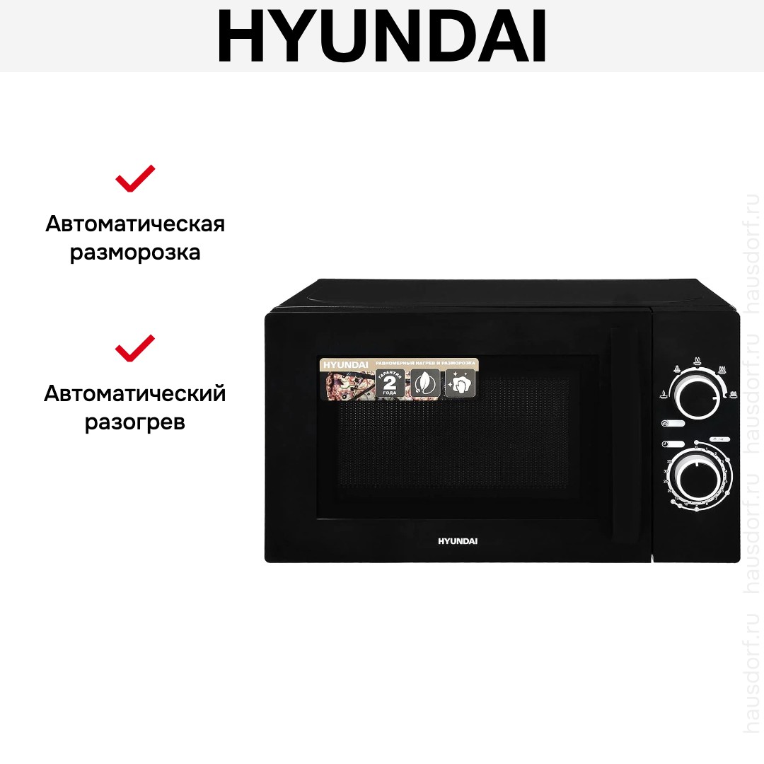 Количество режимов в данной модели Хендай: 5 шт. Для обработки продуктов и готовых блюд используются следующие виды нагрева: Микроволны, Автоматический режим разморозки. Отдельная опция для размораживания продуктов и полуфабрикатов облегчает жизнь — не нужно самостоятельно настраивать параметры.