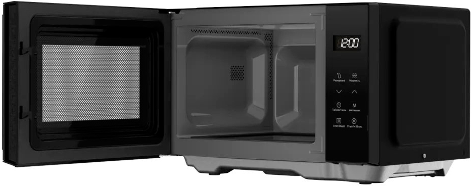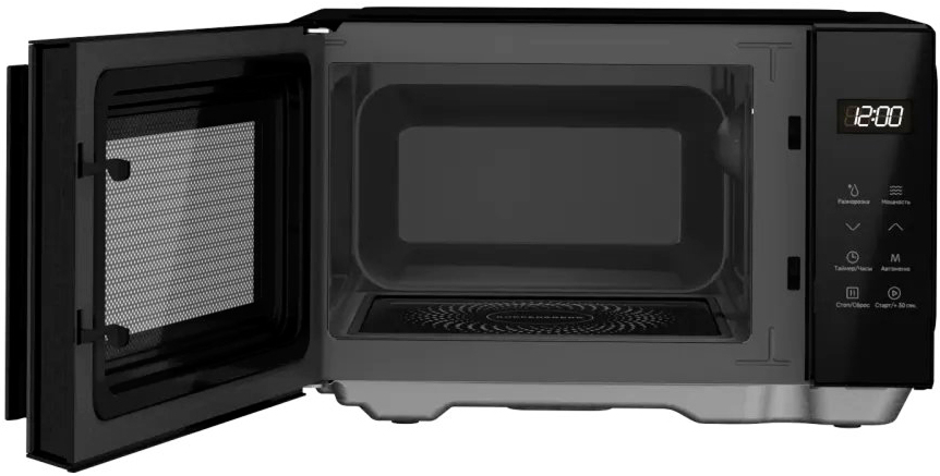 Микроволновые печи могут иметь навесную или откидную дверцу. Модели с навесной дверцей, запирающейся на механические защелки, могут быть как встраиваемыми, так и отдельно стоящими. Такие СВЧ-печи с дверцей, открывающейся влево или вправо, могут относиться к любой категории цен: от самых простых и дешевых до премиальных моделей. Недостатки дверцы с петлями сбоку — выступающая ручка, которая затрудняет очистку фасада, и небольшой угол открытия не более 90 градусов, который может препятствовать, например, размещению прибора в углу. Если ручка действительно мешает, стоит выбрать модель, дверца которой открывается нажатием на кнопку или прикосновением к сенсору на боковой панели управления.