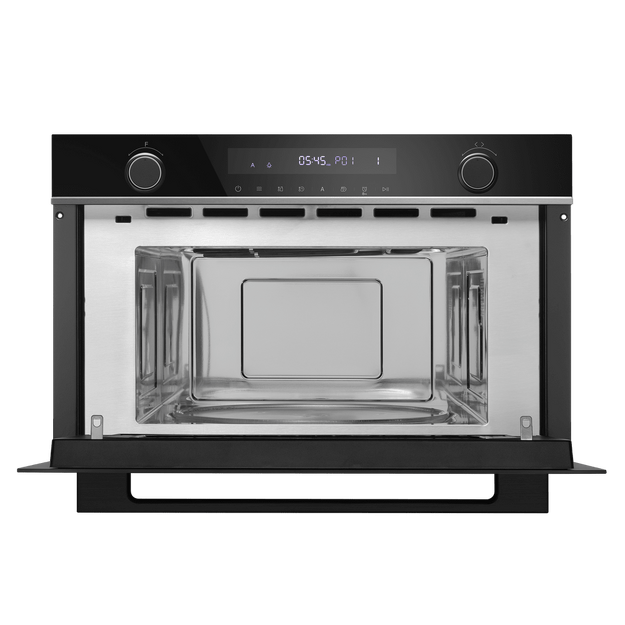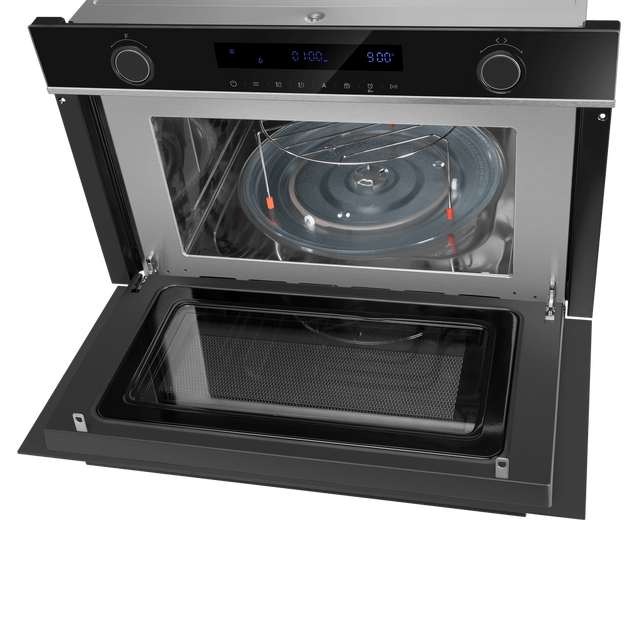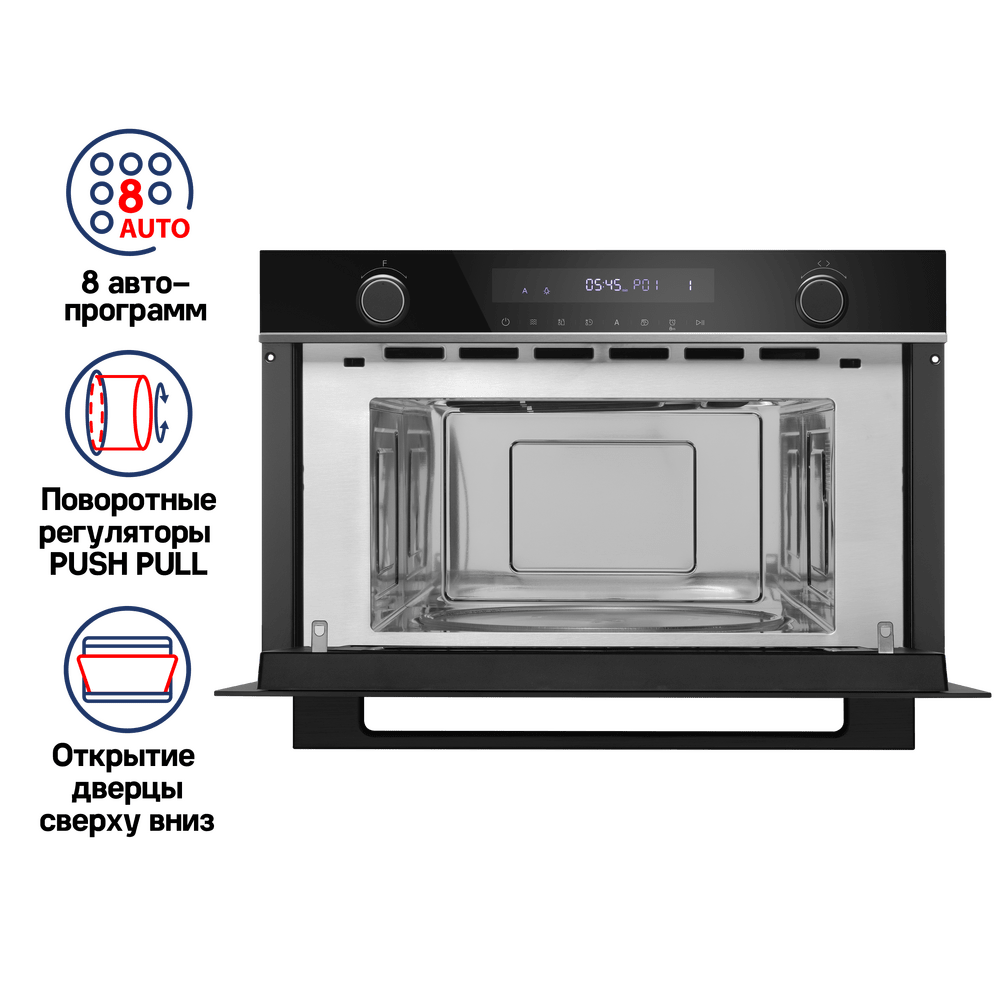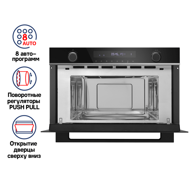 Конвекционный вентилятор устанавливается в микроволновках без поворотного стола: равномерное распределение горячего воздуха позволяет размещать в камере сразу несколько блюд. Комбинация вентилятора и верхнего гриля называется турбогрилем: этот режим очень хорош для выпечки больших пирогов и кексов. Сочетание гриля и конвекции подойдет и для приготовления больших кусков мяса или целой птицы и рыбы. Добавление традиционного нижнего нагревательного элемента превращает микроволновую печь в аналог полноценной духовки: с ее помощью можно готовить, разогревать и размораживать, запекать и томить, обжаривать и тушить.
