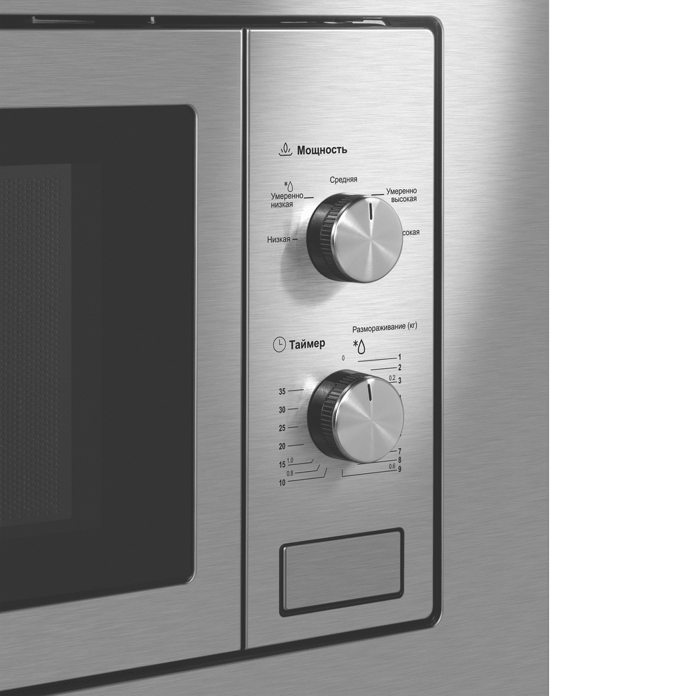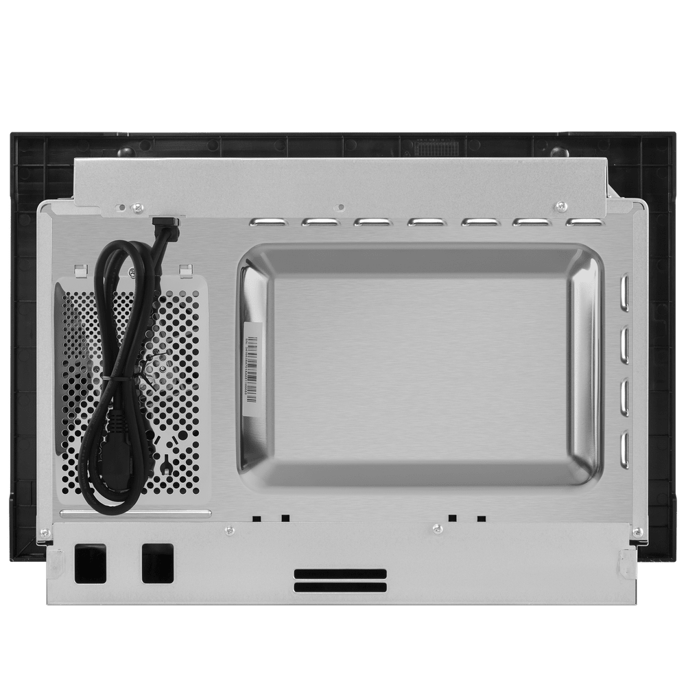 Встраиваемая модель имеет камеру объёмом 20 литров. Габариты 38.2×59.5×34.5 предусматривают размещение в нишу размерами 38×56×55 см. Нагрев производится с помощью микроволн мощностью 1250 Вт и гриля: его мощность достигает 1 кВт. Пять ступеней регулировки микроволн дают возможность точнее подбирать режим под разные блюда. Внутренняя подсветка позволяет наблюдать за процессом, а вращающееся стеклянное блюдо диаметром 24.5 см равномерно распределяет тепло. Специальный режим поможет разморозить замороженные продукты.