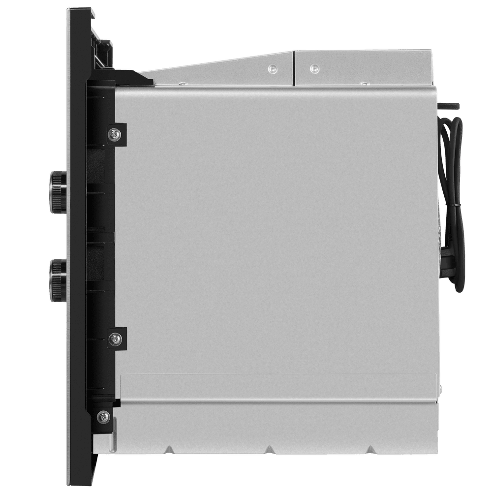 Передняя панель выполнена в оттенке нержавеющей стали — спокойный металлический окрас корпуса и фурнитуры придают прибору сдержанную элегантность. Навесная дверца с левой петлёй и кнопочным механизмом открытия аккуратно вписывается в модульную кухню; внутренняя камера изнутри покрыта нержавеющей сталью, что подчёркивает цельность всего образа.